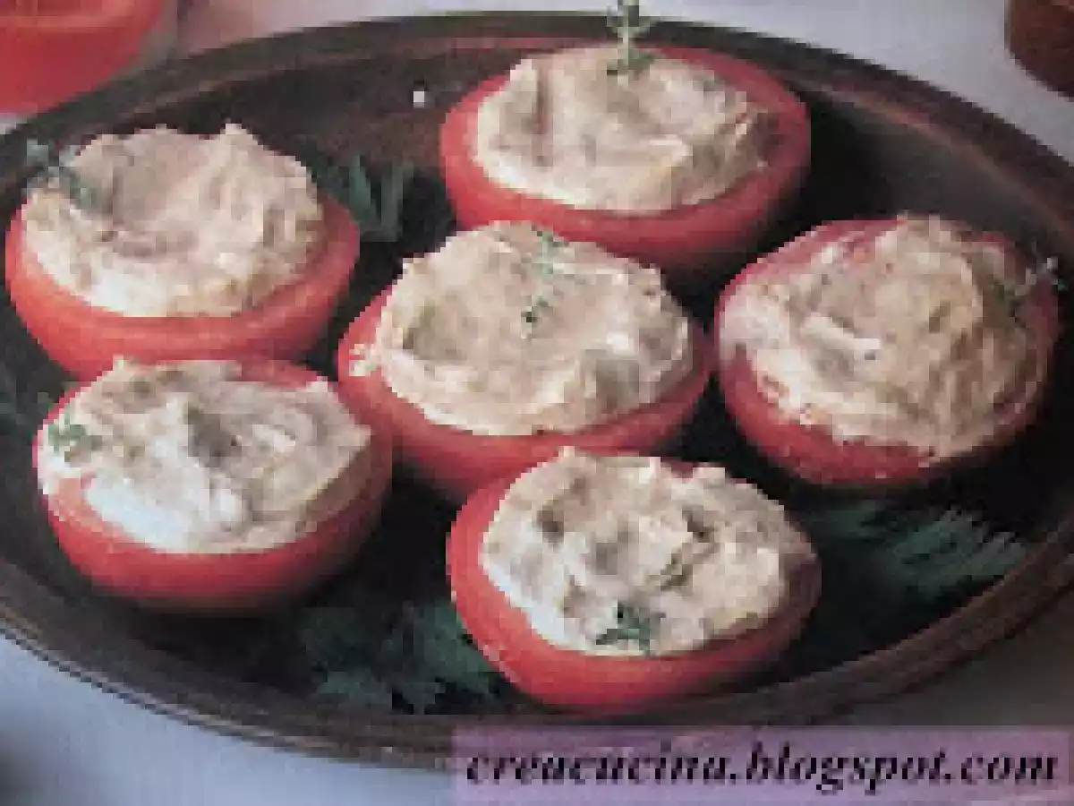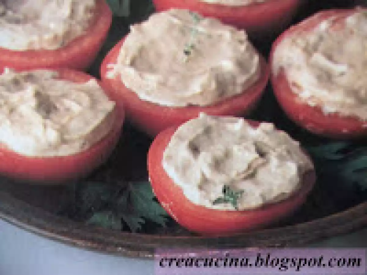 Pomodori ripieni di salsa tonnata PrecedenteProssimo Antipastofacile45 min340 Kcal Invia questa ricetta ad un amico Stampa la ricetta Contatta l'autore della Ricetta Pubblica la foto di questa ricetta Ingredienti 4 2 pomodori tondi a grappolo 4 filetti di acciuga 100 g di tonno in scatola sgocciolato 1 cucchiaio di capperi 4 cucchiai di olio extra vergine di oliva 1 cucchiaio di succo di limone o aceto bianco un cucchiaino di prezzemolo tritato