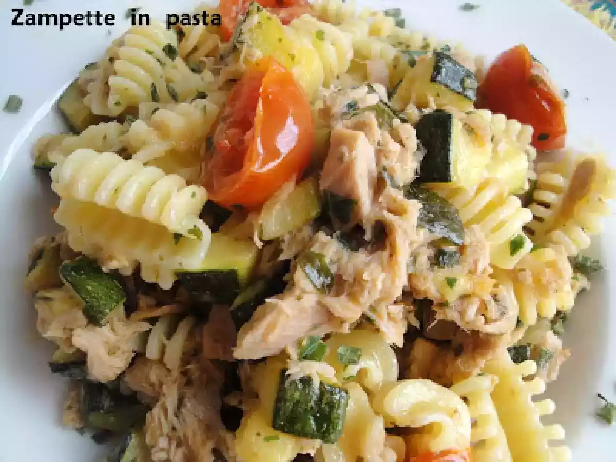 Scolate il tonno dal suo olio di conservazione e unitelo alle verdure in cottura, mescolate il tutto, regolate di sale e cuocete a fuoco dolce per cinque minuti, spegnete.Portata a bollore l'acqua, salate e cuocete la pasta per il tempo indicato sulla confezione, scolatela e mettetela nella pentola con il tonno e le verdure. - Riaccendete il fuoco, mescolate, lasciate insaporire per un minuto e spegnete, cospargete con il prezzemolo tritato e servite.