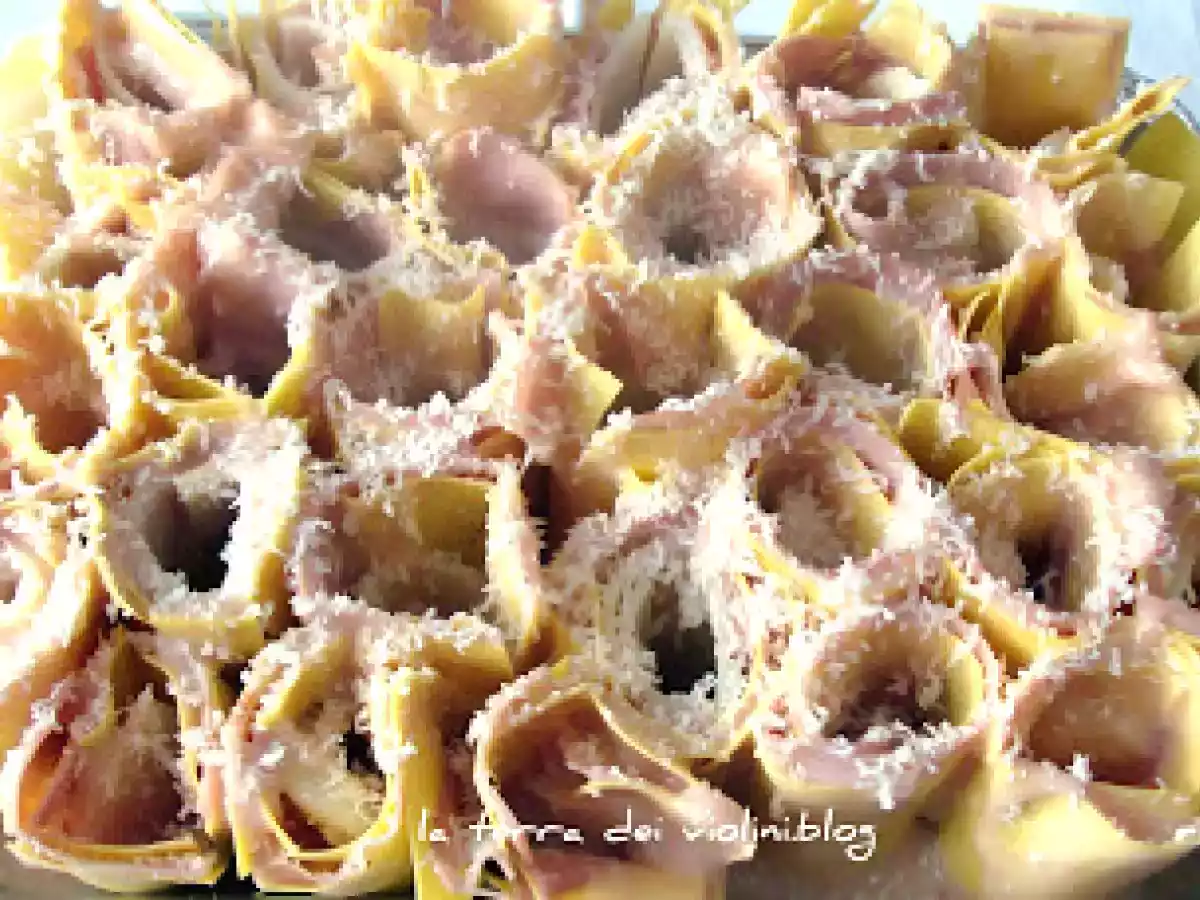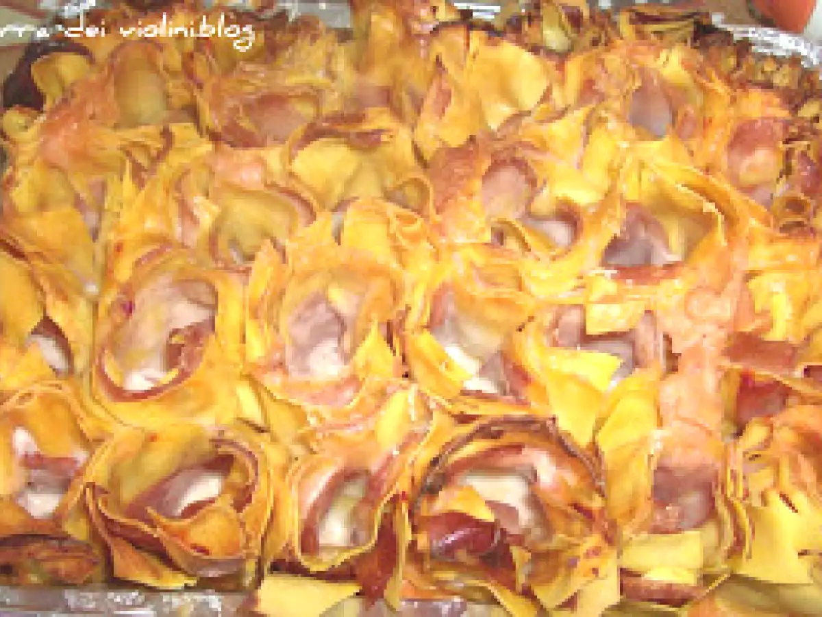 Rose al forno vota adesso PrecedenteProssimo Antipastofacile40 min Invia questa ricetta ad un amico Stampa la ricetta Contatta l'autore della Ricetta Pubblica la foto di questa ricetta Concedetevi questo piccolo grande sorpresa. Ingredienti 8 12 fette di prosciutto cotto 6 fette di fontina grana padano grattugiato Besciamella rosa: 250 g di latte 250 g di panna 20 g di burro 20 g di farina 1 cucchiaio di concentrato di pomodoro sale-pepe Sfoglia: 220 g di farina 0 2 uova