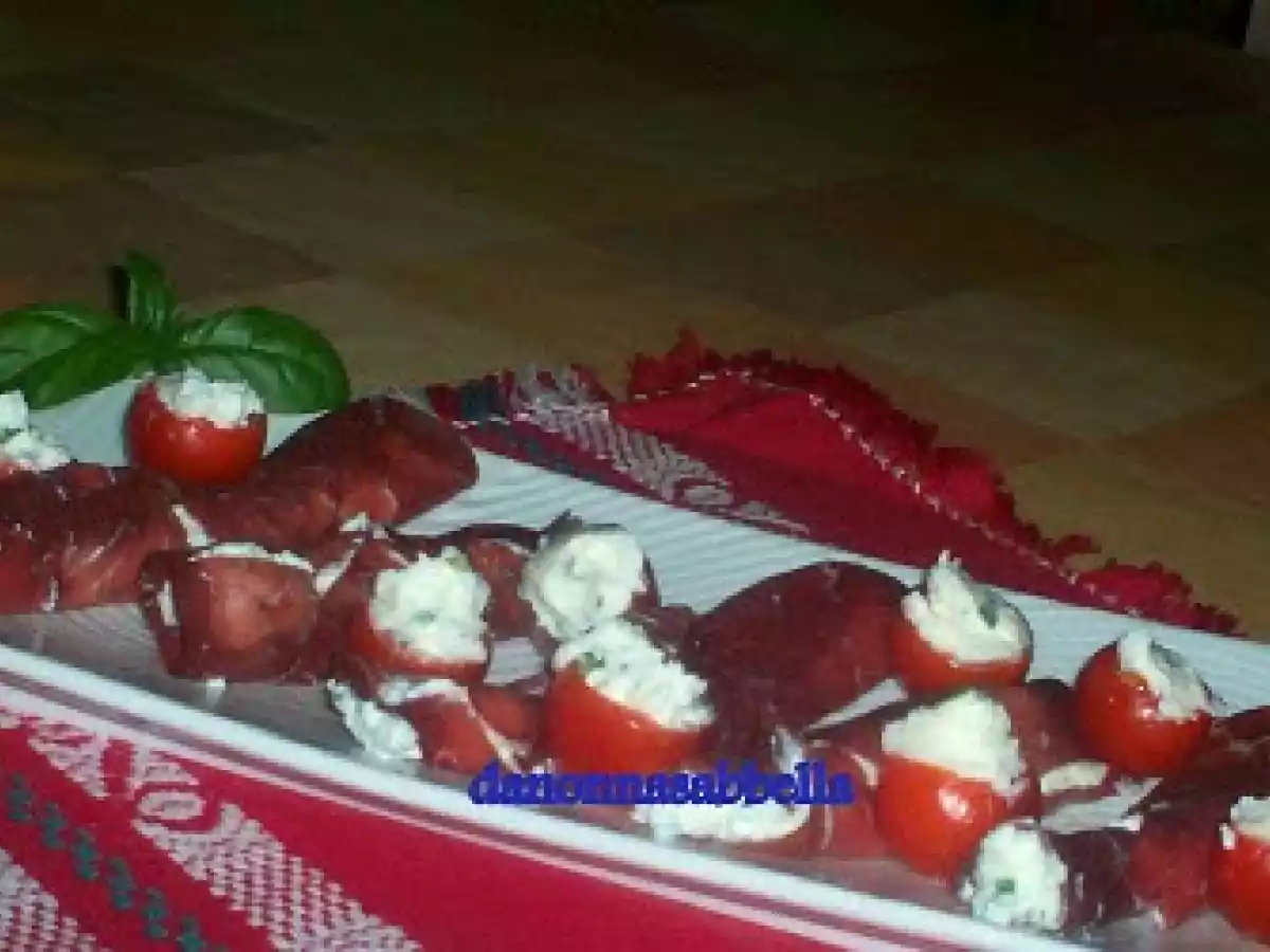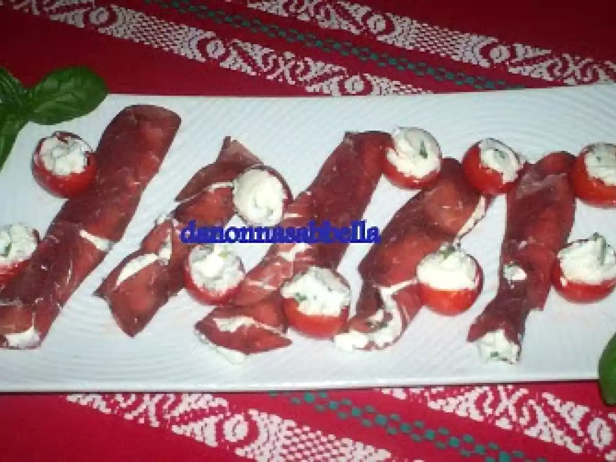 Rotolini di bresaola con ricotta e basilico PrecedenteProssimo Antipastofacile25 min157 Kcal Invia questa ricetta ad un amico Stampa la ricetta Contatta l'autore della Ricetta Pubblica la foto di questa ricetta Un antipasto fresco e profumato Ingredienti 2 5/6 fettine di bresaola 120 gr ricotta magra 5/6 foglie di basilico fresco 10 pomodorini qualita'ciliegino Costo stimato: 4.09Euros€ (2.04€/Porzioni)