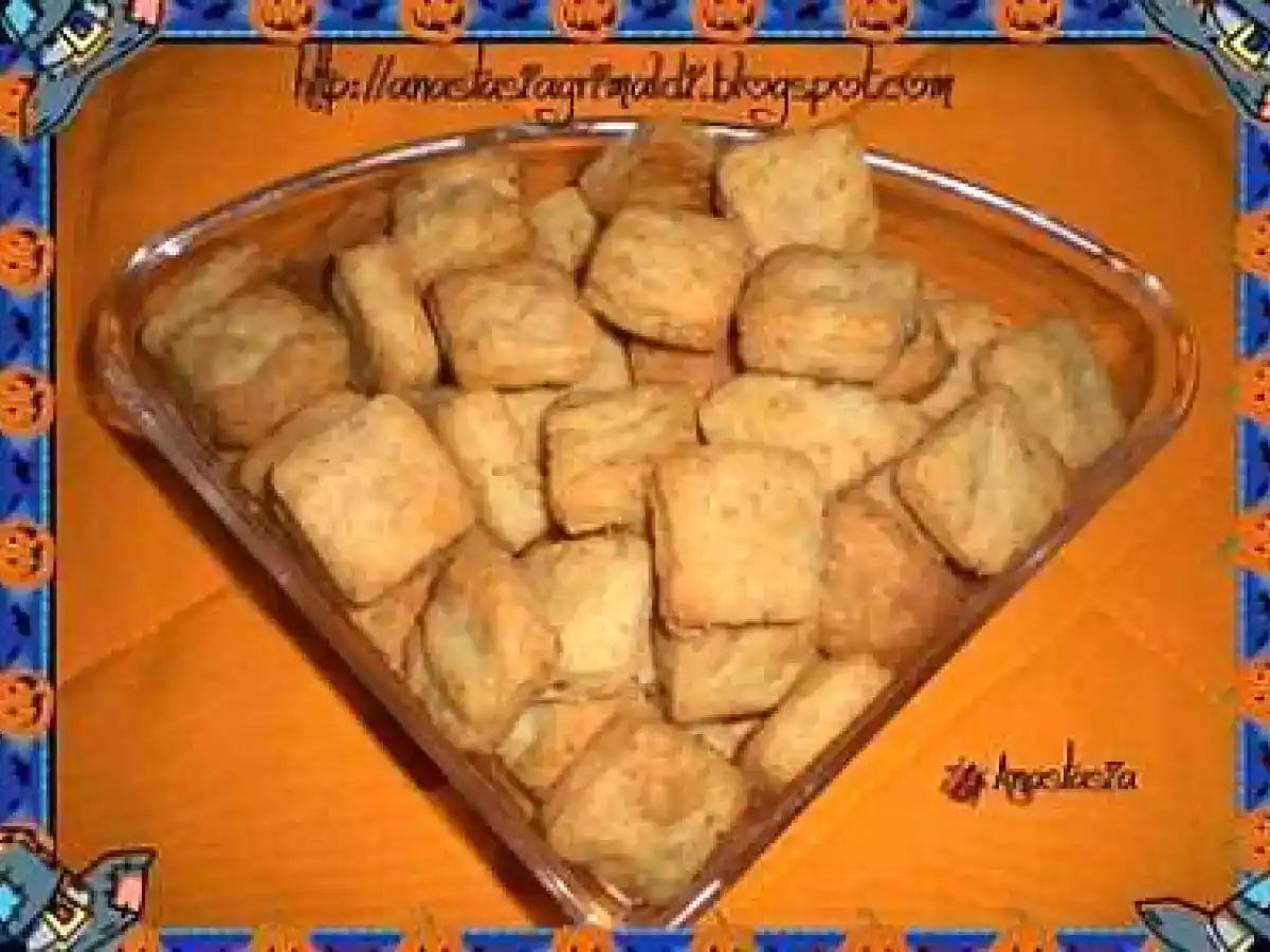 Salatini olive e pecorino Antipastomedia40 min Invia questa ricetta ad un amico Stampa la ricetta Contatta l'autore della Ricetta Pubblica la foto di questa ricetta Ingredienti 6 Ingredienti per circa 60 salatini: 75 g di farina bianca 50 g di farina di grano saraceno (più quella per il piano di lavoro) 80 g di burro 100 g di pecorino 40 g di olive verdi denocciolate Sale (io l'ho omesso, il pecorino e le olive son già abbastanza salati!) Pepe