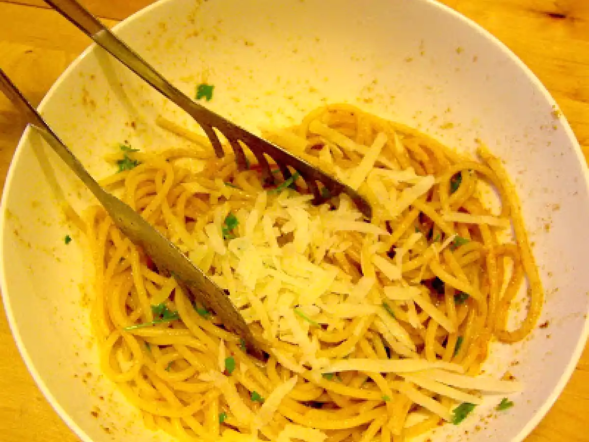 Spaghetti di gragnano con bottarga, scaglie di pecorino romano e prezzemolo dell'orto