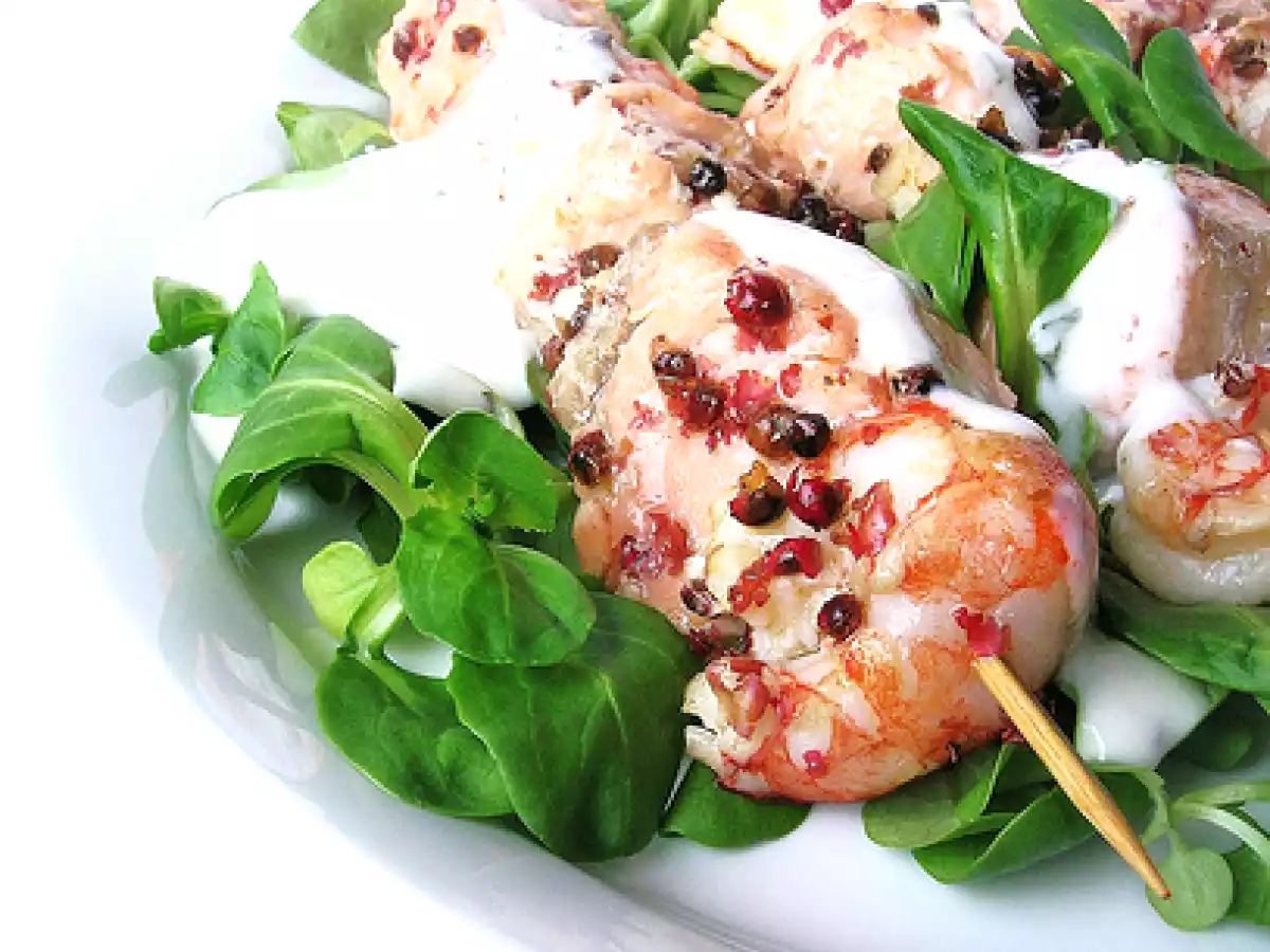 Spiedini di salmone e gamberoni al pepe rosa con dressing allo yogurt