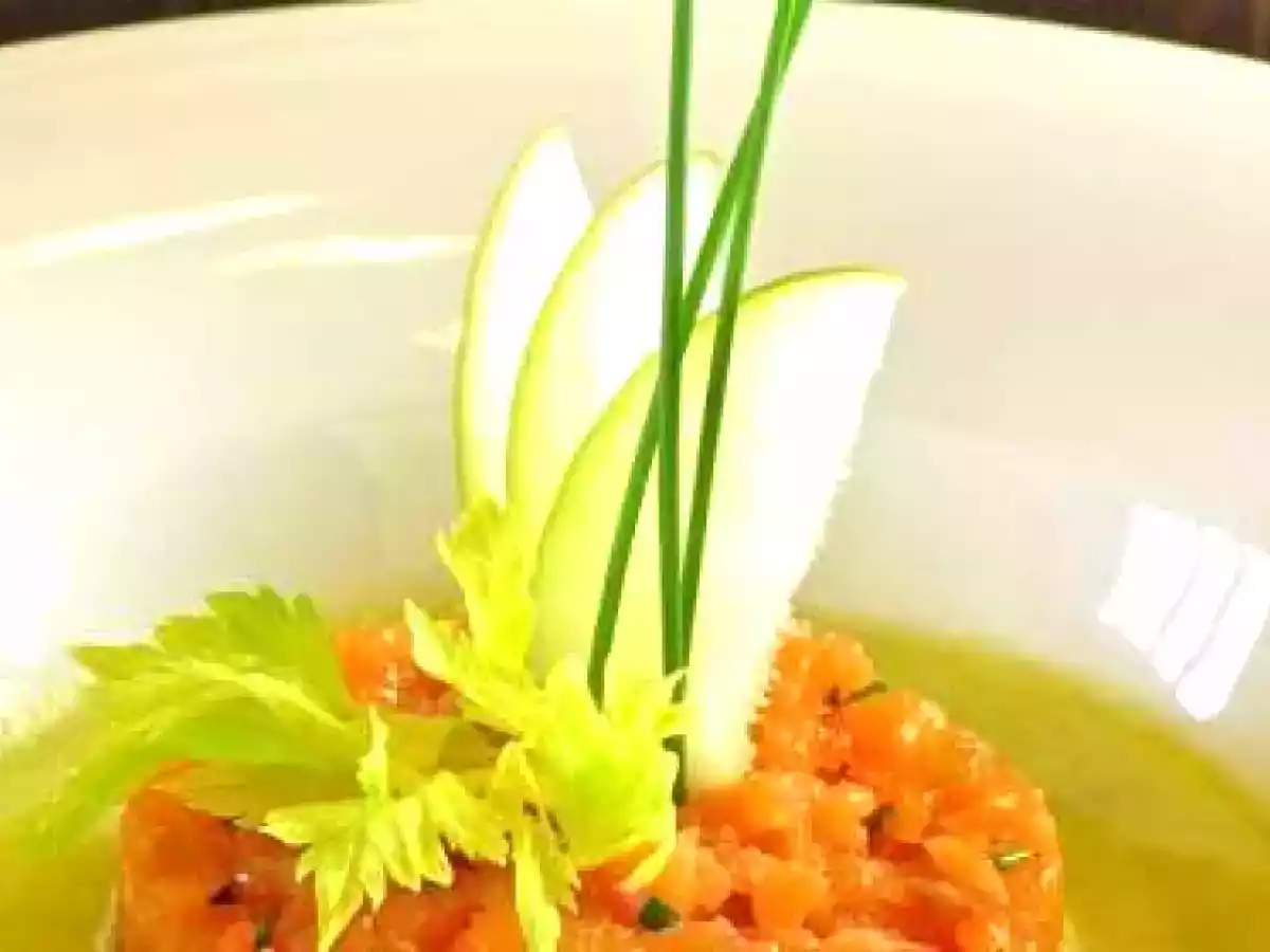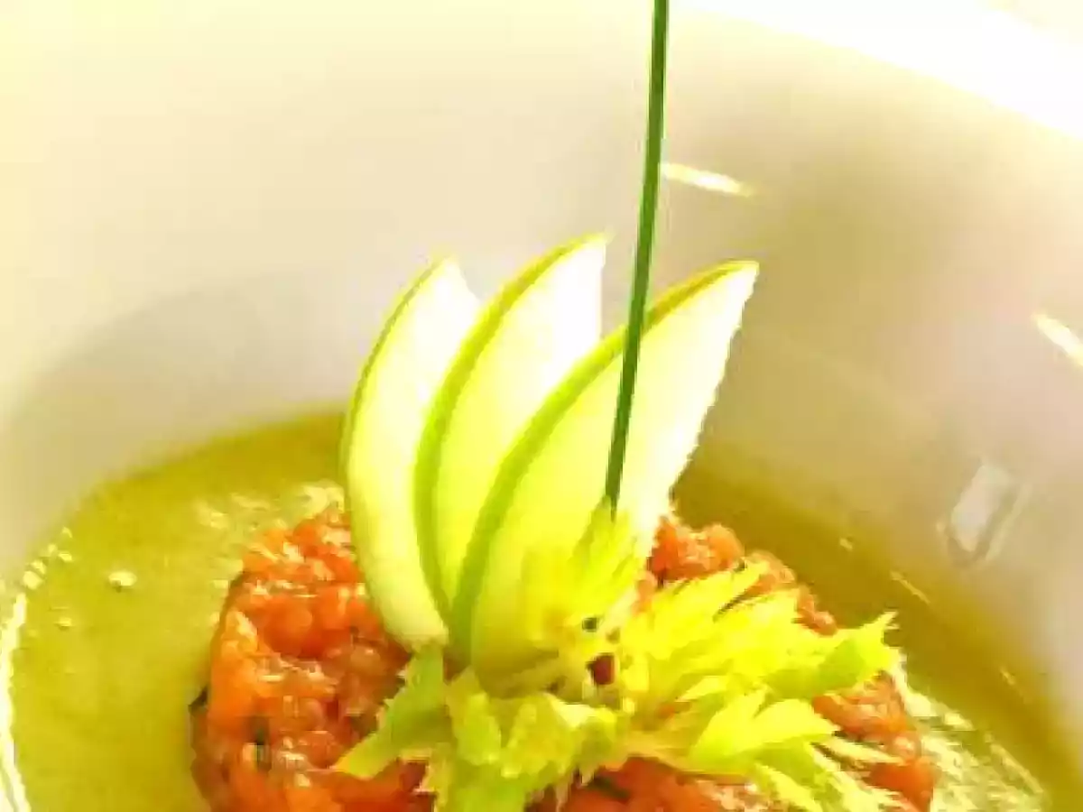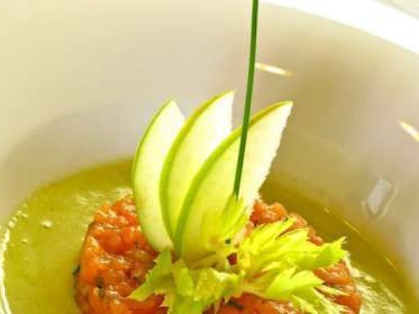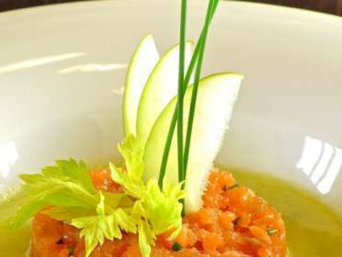 Tartare di salmone con zuppa fredda di sedano e mela