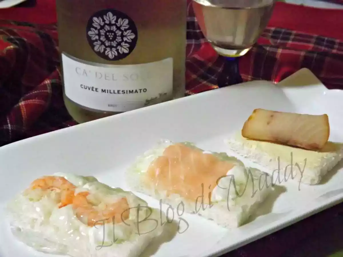 Tartine di salmone, gamberetti e pesce spada con cuvée cà del sole