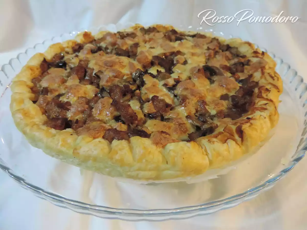 Gustosa torta di pasta sfoglia farcita con funghi misti, salsiccia e caciocavallo