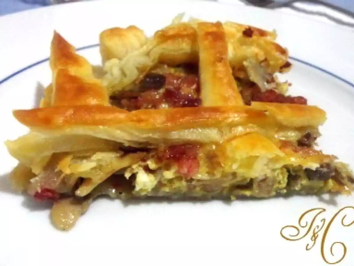 Torta salata funghi e salsiccia PrecedenteProssimo Antipastomedia1 h 30 m Invia questa ricetta ad un amico Stampa la ricetta Contatta l'autore della Ricetta Pubblica la foto di questa ricetta Ingredienti 6 2 salsicce 2 etti e mezzo di funghi champignon Vinchef olio aglio sale pepe prezzemolo 2 uova parmigiano 1 rotolo di pasta sfoglia.