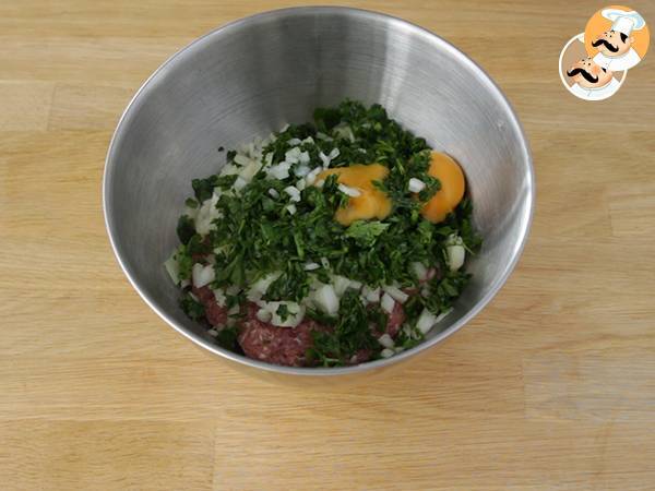 Adesso mettete in una ciotola la salsiccia sbriciolata, l'aglio tritato, la cipolla a pezzetti, il sale, il pepe, i tuorli d'uovo e il prezzemolo tritato. Quindi impastate con le mani.