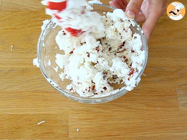 Tagliate il salame a pezzettini piccoli e aggiungetelo agli albumi. Incorporate anche l'Emmental grattugiato, le erbe aromatiche ed il pepe. Quindi mescolate delicatamente facendo attenzione a non smontare gli albumi.