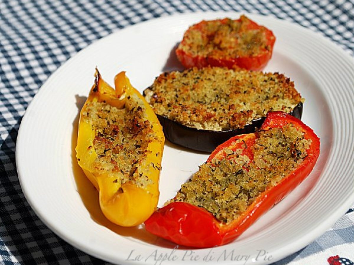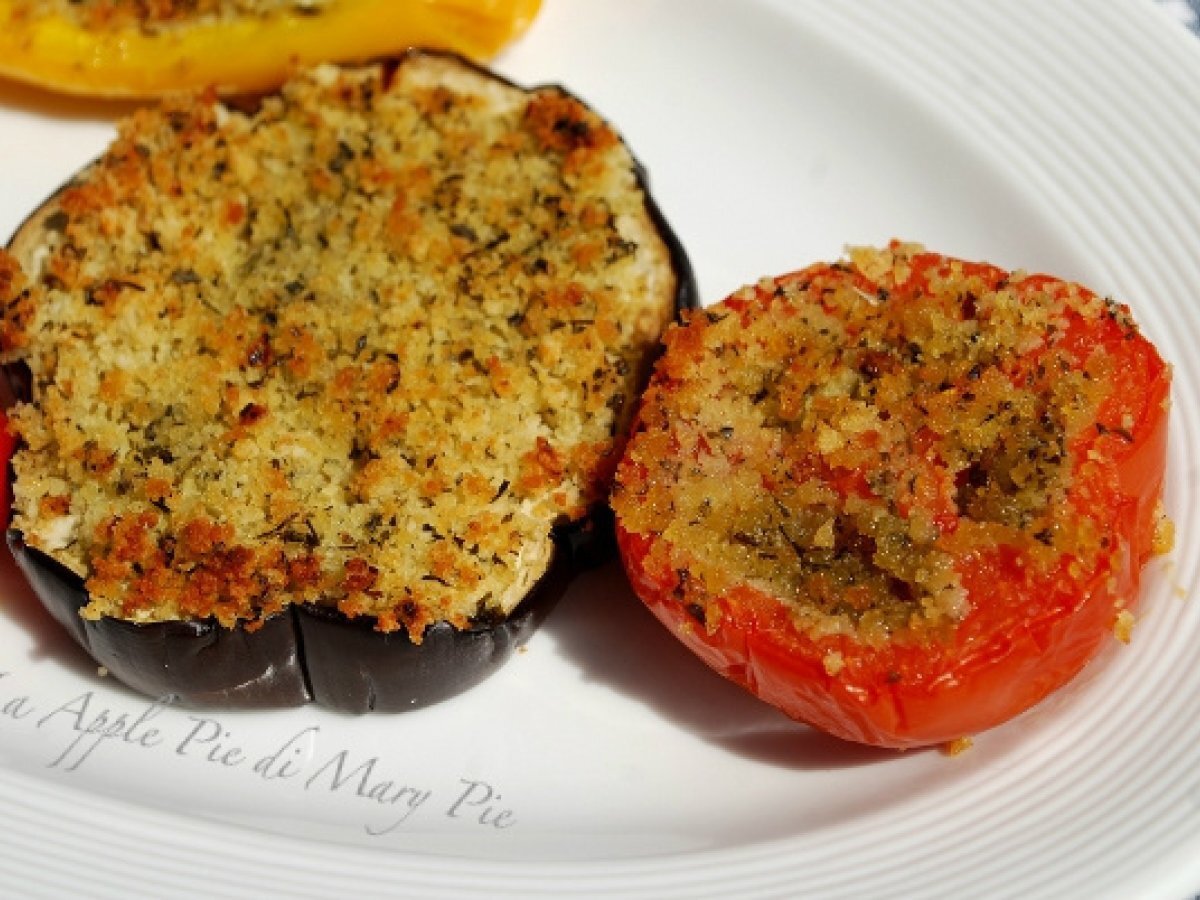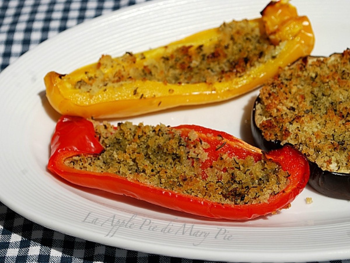 Verdure miste al forno ripiene con mollica saporita PrecedenteProssimo Antipastofacile1 h 20 m203 Kcal Invia questa ricetta ad un amico Stampa la ricetta Contatta l'autore della Ricetta Pubblica la foto di questa ricetta Ingredienti 8 Per la mollica condita: 175 g mollica di pane di grano duro leggermente rafferma 1/4 di cipolla 8 g di sale fino qualche foglia di basilico un ciuffo di prezzemolo 2 prese abbondanti di origano 2-3 fogliette di menta (non di più) 100 ml di olio extravergine di oliva 1 grossa melanzana viola lunga 1 peperone giallo 1 peperone rosso 4 pomodori ramati olio extravergine di oliva per irrorare Costo stimato: 3.7Euros€ (0.46€/Porzioni)
