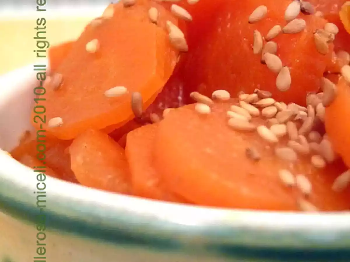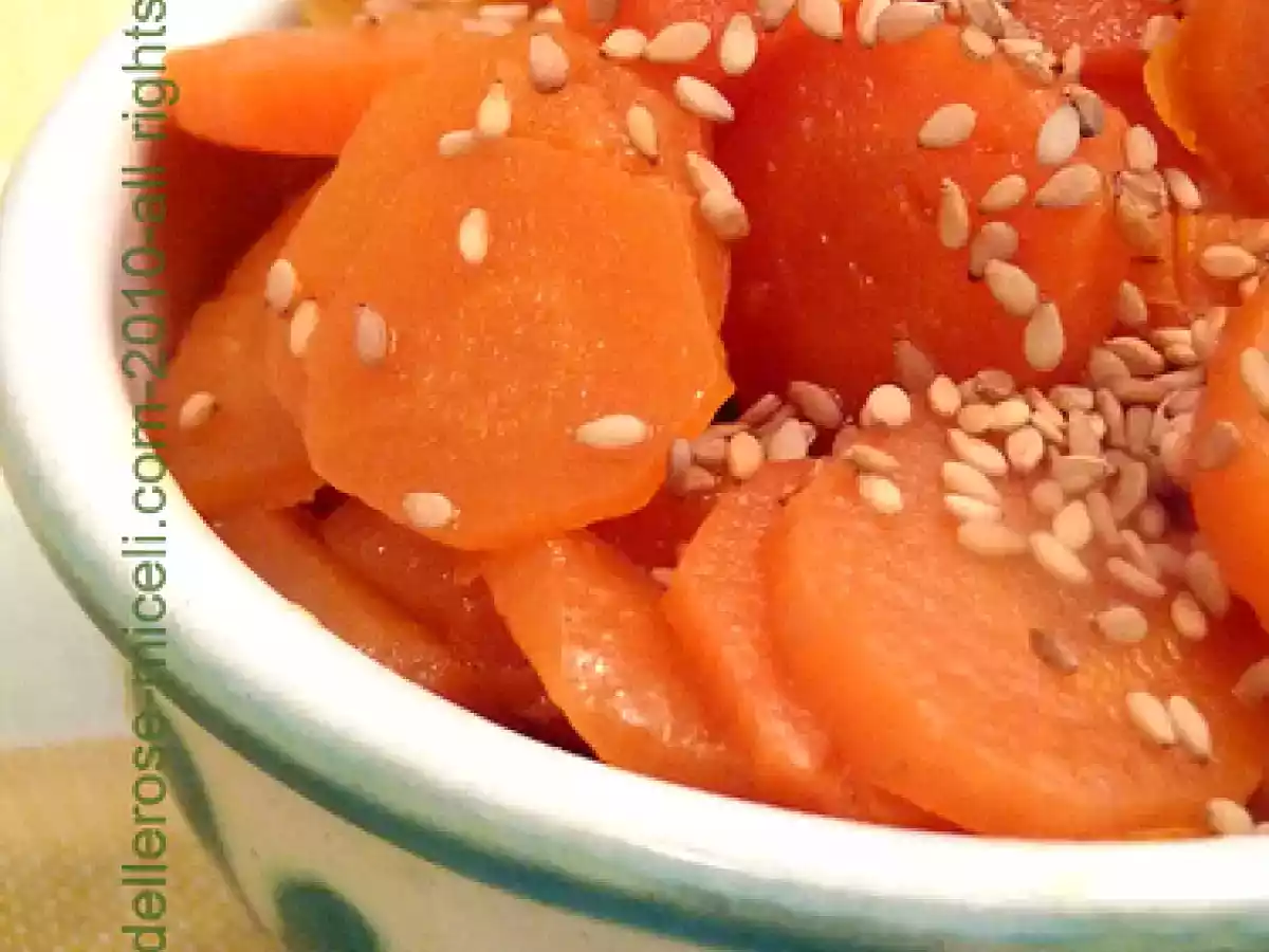 Carote glassate all'arancia e sesamo dorato vota adesso PrecedenteProssimo Contornifacile45 min334 Kcal Invia questa ricetta ad un amico Stampa la ricetta Contatta l'autore della Ricetta Pubblica la foto di questa ricetta Ingredienti 3 1 kg di carote novelle 20 g di zucchero 50 g di burro 1 arancia non trattate 1 cucchiaio di sesamo tostati sale Costo stimato: 2.72Euros€ (0.91€/Porzioni)