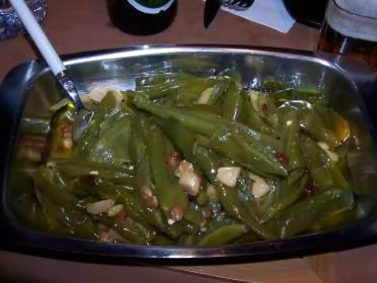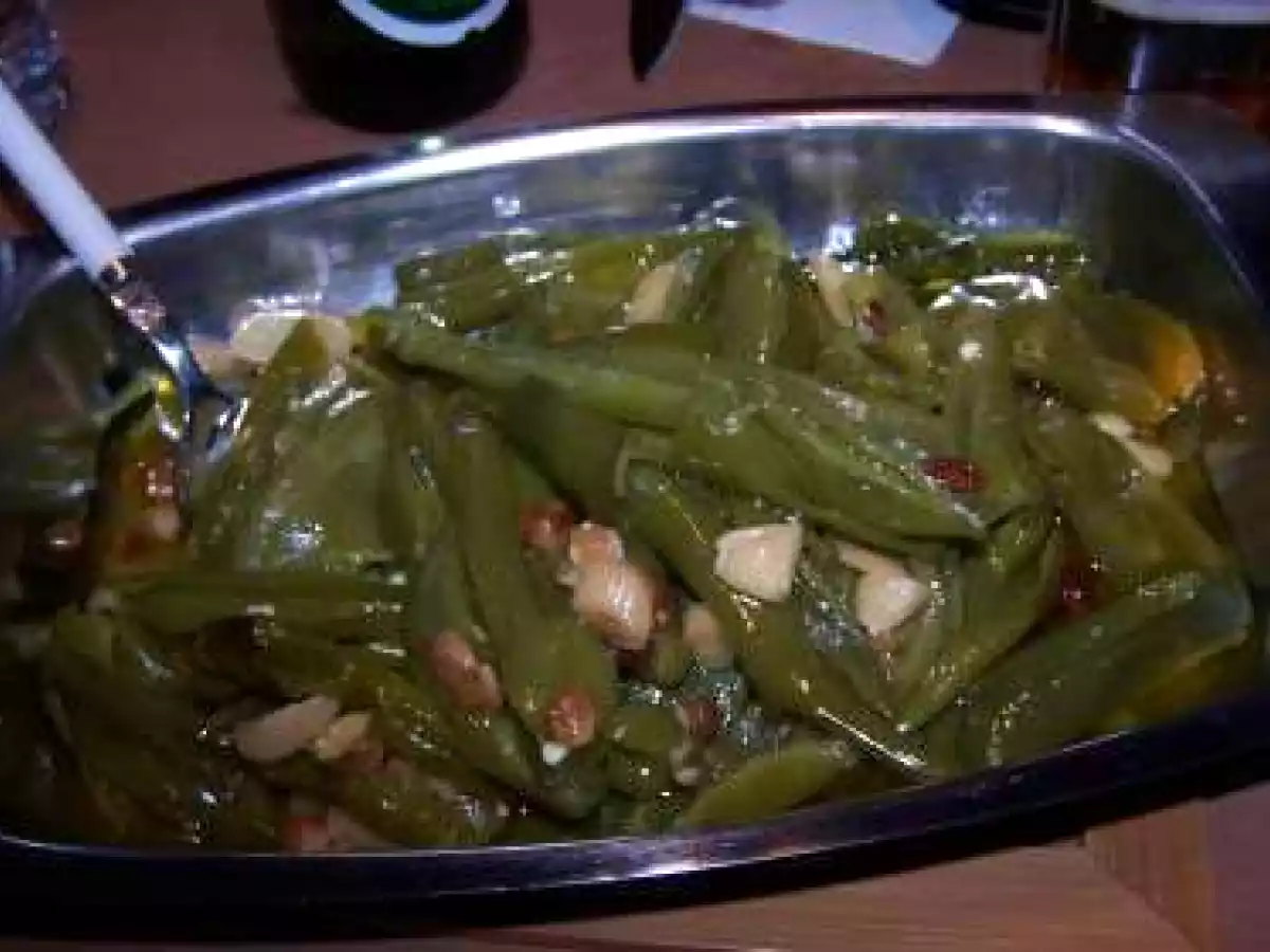 - Nella padella con olio caldo si aggiunge l'aglio, si fa dorare un po,peperoncino, poi i friggitelli,le mandorle sgusciate. Si fa cuocere per circa 1 minuto a fiamma media con coperchio sopra.