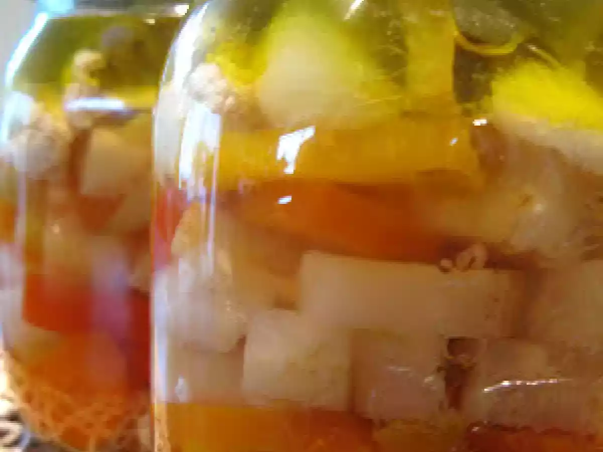Giardiniera in agrodolce Contornifacile30 min Invia questa ricetta ad un amico Stampa la ricetta Contatta l'autore della Ricetta Pubblica la foto di questa ricetta Ingredienti 4 1 cavolfiore 6 carote 1 sedano rapa 1 sedano 250 g cipolline 2 peperoni 2 l aceto bianco 1 dl olio extravergine di oliva 1 cucchiaino di sale 200 g zucchero Timo Alloro Pepe in grani Chiodi di garofano 4 vasi da 250 g 1 vaso da 500 g