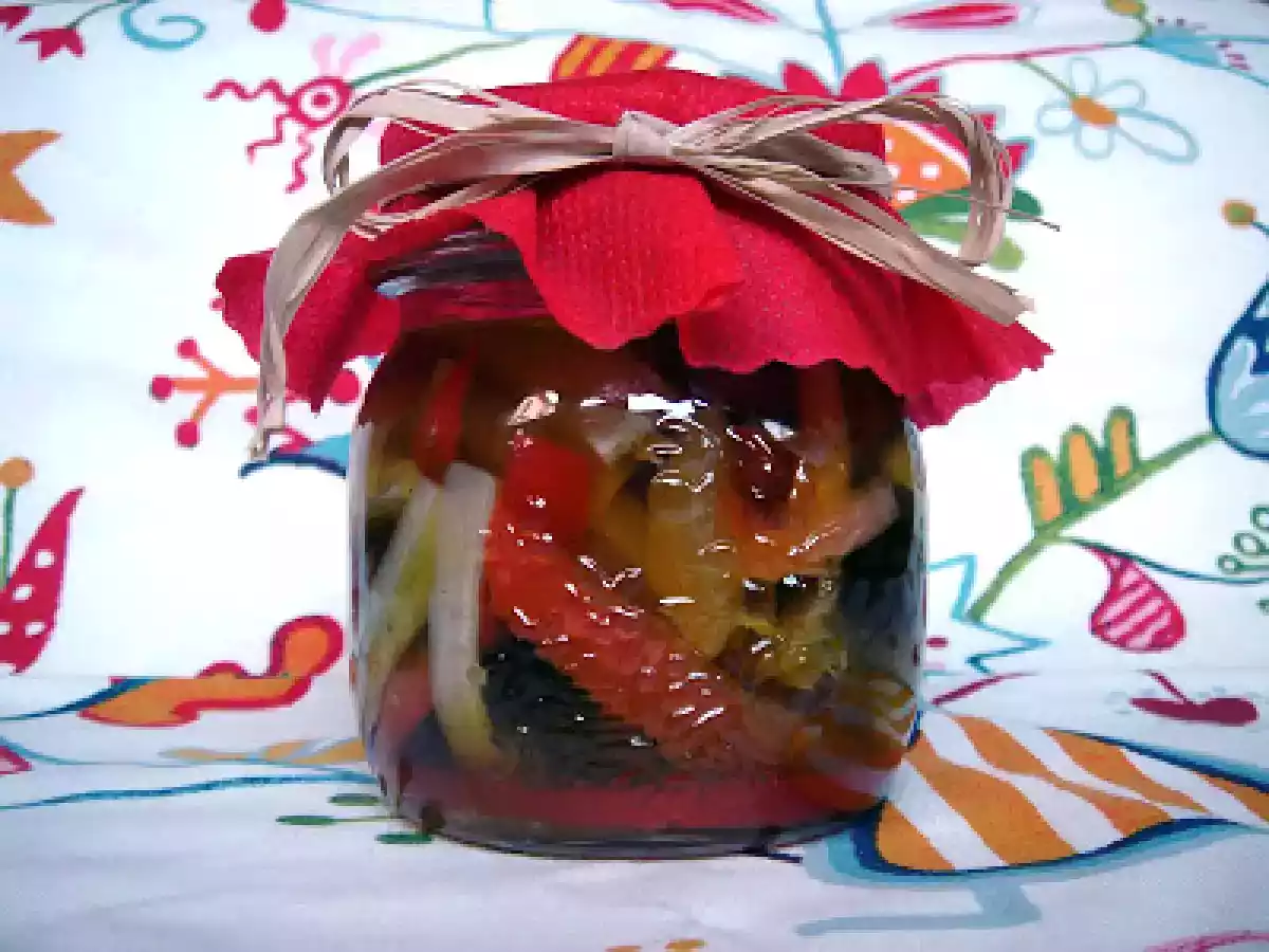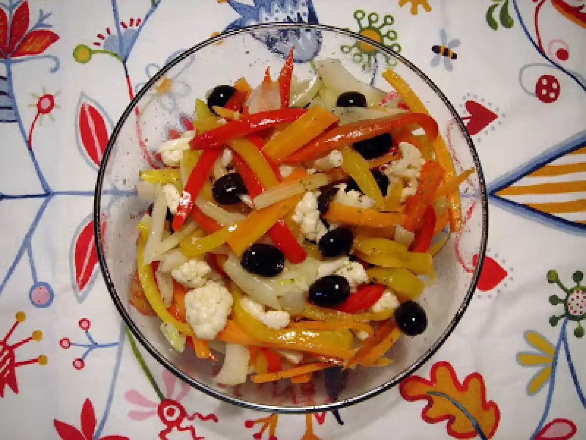 Insalata giardiniera PrecedenteProssimo Contornifacile40 min383 Kcal Invia questa ricetta ad un amico Stampa la ricetta Contatta l'autore della Ricetta Pubblica la foto di questa ricetta Una ricetta colorata di tonalità brillanti e vivaci. Ingredienti 4 1 piccolo cavolfiore 2 carote medie 1 finocchio 1 falda di peperone rosso 1 falda di peperone giallo 1 falda di peperone verde 2 coste di sedano 3 scalogni 100 gr di olive nere denocciolate 3 dl di aceto di vino bianco origano pepe nero appena macinato sale olio extravergine d'oliva Costo stimato: 5.79Euros€ (1.45€/Porzioni)