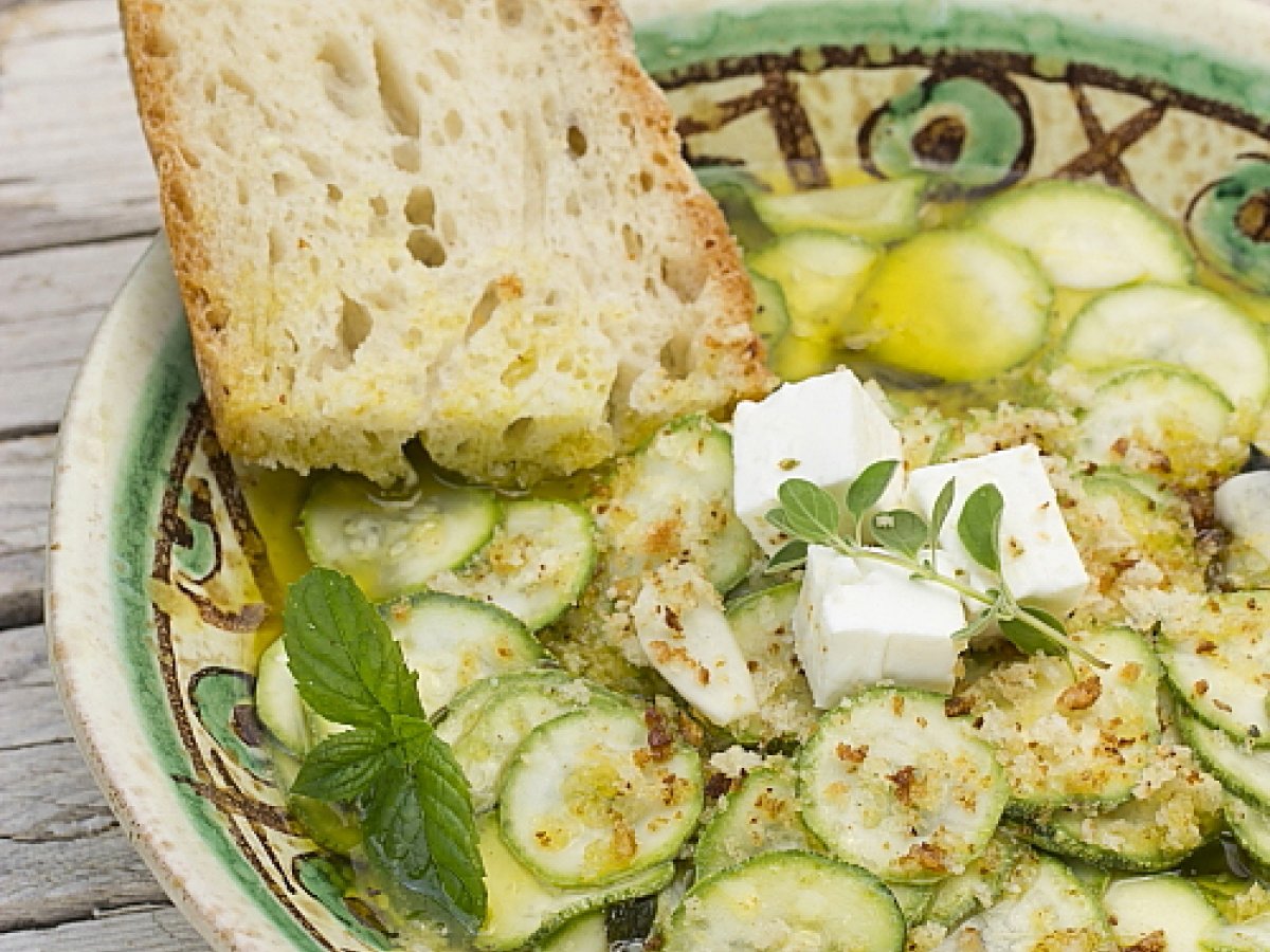 zucchine crude affettate sottili e marinate in olio aceto ed erbe aromatiche. Le dosi sono a piacere e il condimento prevede quantità di aceto e aglio secondo i propri gusti