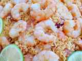 Ingredienti: 1 Kg di code di gamberoni 5 pomodori grandi rossi e sodi 4 cipolle fresche Il succo di tre limoni 400 g di couscous precotto Olio Sale