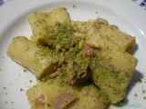 Ingredienti: 320 g di Paccheri di Gragnano 1 cipolla bianca 100 g di prosciutto cotto 10 g di pinoli 1/2 bicchiere di vino bianco 2 cucchiai di pesto di...