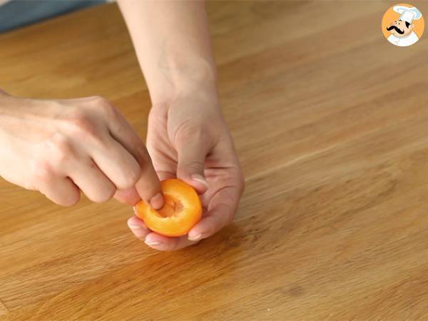 Lavate le albicocche. Tagliatele in due ed eliminate il nocciolo. Disponetele nello stampo imburrato con la parte tagliata verso l'alto.