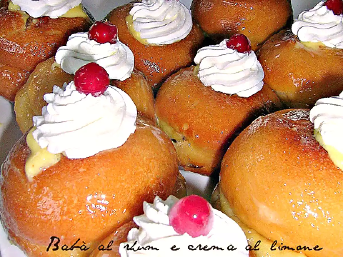 Babà al rhum con crema al limone DessertDifficile1 ora1039 Kcal Invia questa ricetta ad un amico Stampa la ricetta Contatta l'autore della Ricetta Pubblica la foto di questa ricetta Ingredienti 8 Per l'impasto babà: 400gr di farina forte 160 gr di burro 400 gr di uova intere 40gr di zucchero semolato 20gr di lievito di birra 8gr di sale Per la bagna al Rhum: 2l di acqua 900 gr di zucchero 300 ml di rhum al 70 1 stecca di cannella scorza di un limone scorza di un'arancia 1 bacca di vaniglia usata per la finitura: 200gr di crema pasticciera 40 gr di pasta limone 100 gr di panna montata frutti di bosco a piacere