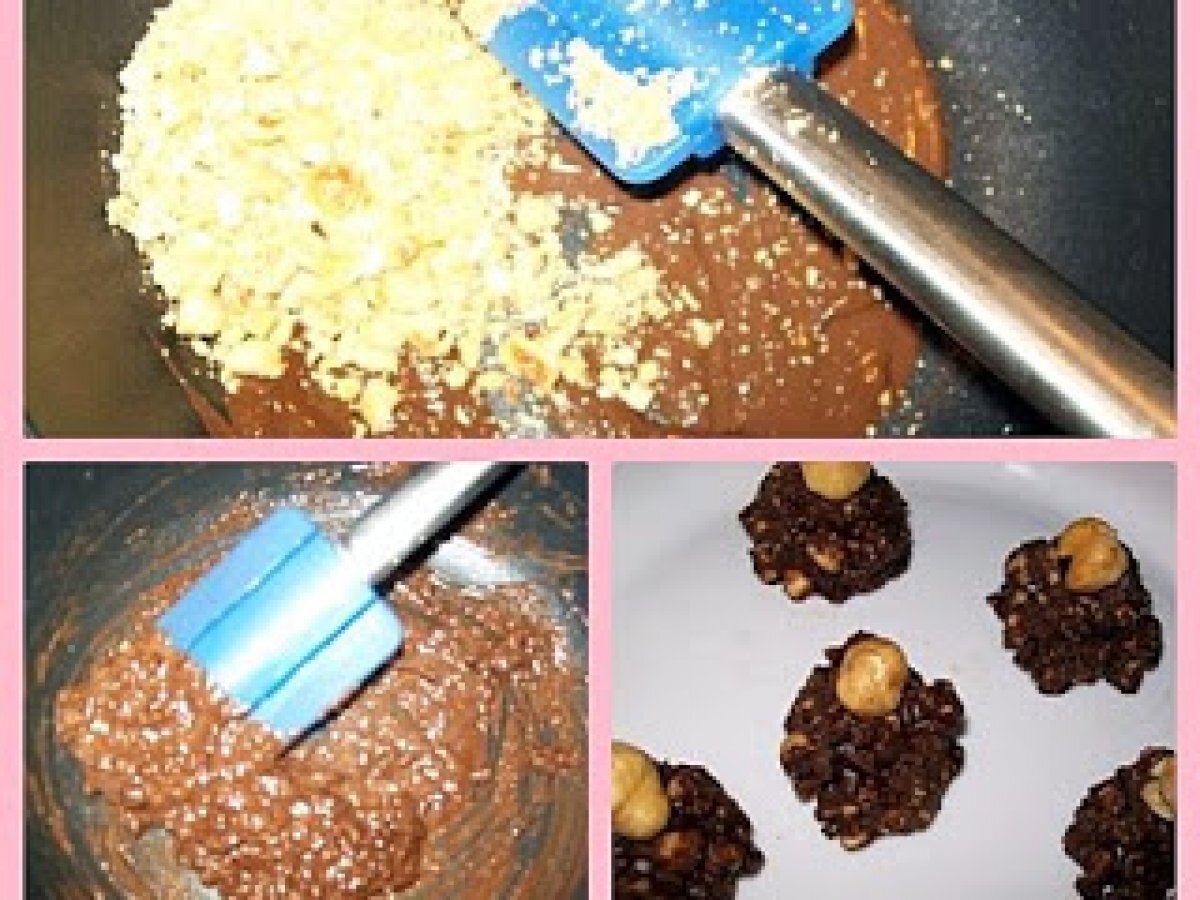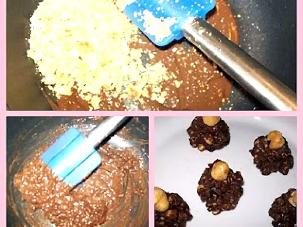 - Sciogliere il cioccolato fondente e immergervi i mucchietti di nocciole.