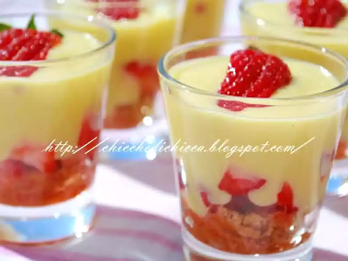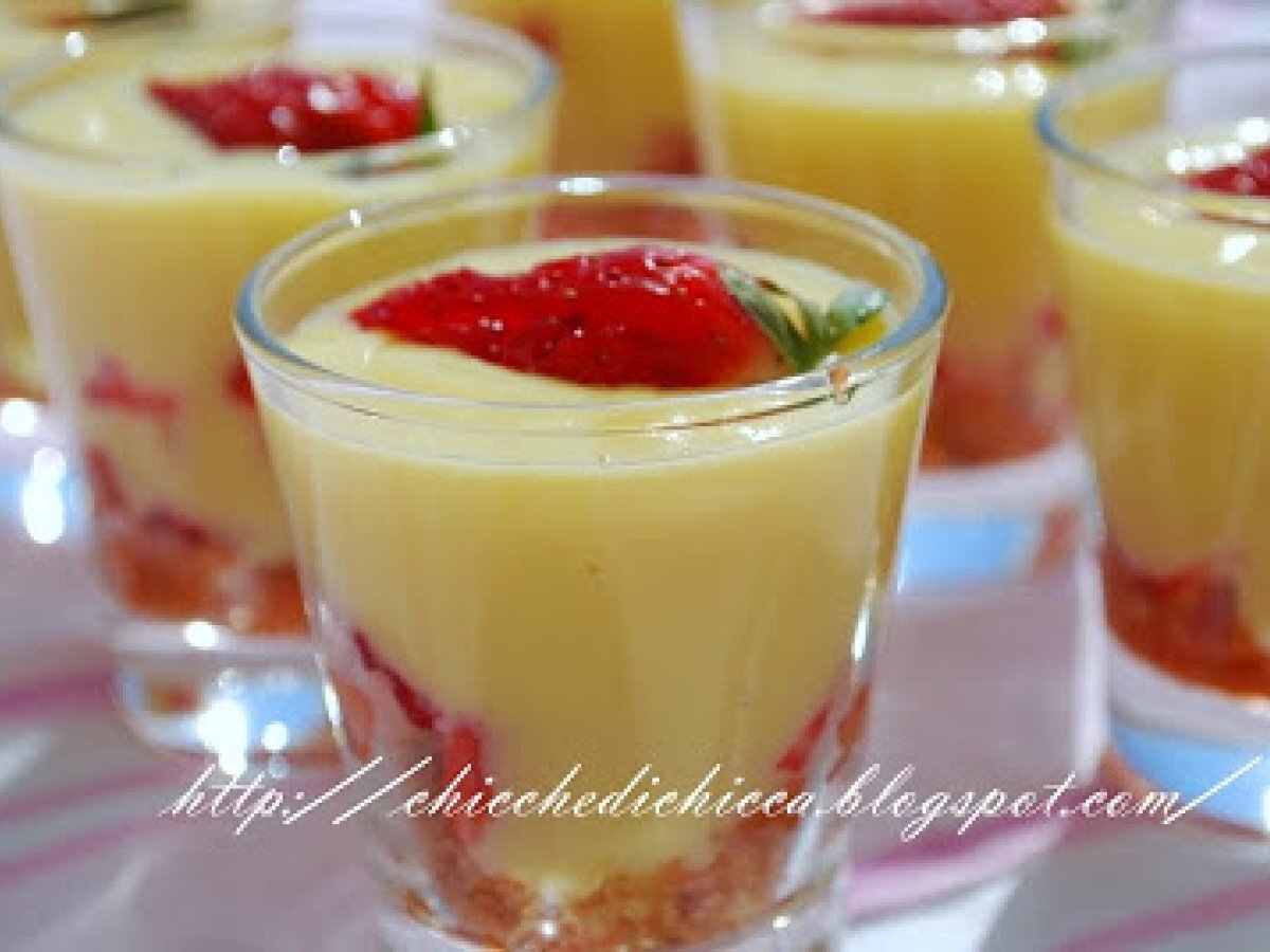 Bicchierini fragole e crema al cioccolato bianco PrecedenteProssimo Dessertfacile40 min Invia questa ricetta ad un amico Stampa la ricetta Contatta l'autore della Ricetta Pubblica la foto di questa ricetta Ingredienti 3 6 biscotti tipo savoiardi 10 fragole 200 g di crema pasticcera 100 g di cioccolato bianco Succo di ½ limone 2 cucchiai di zucchero