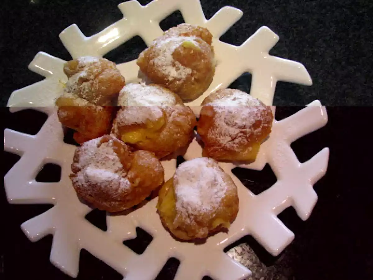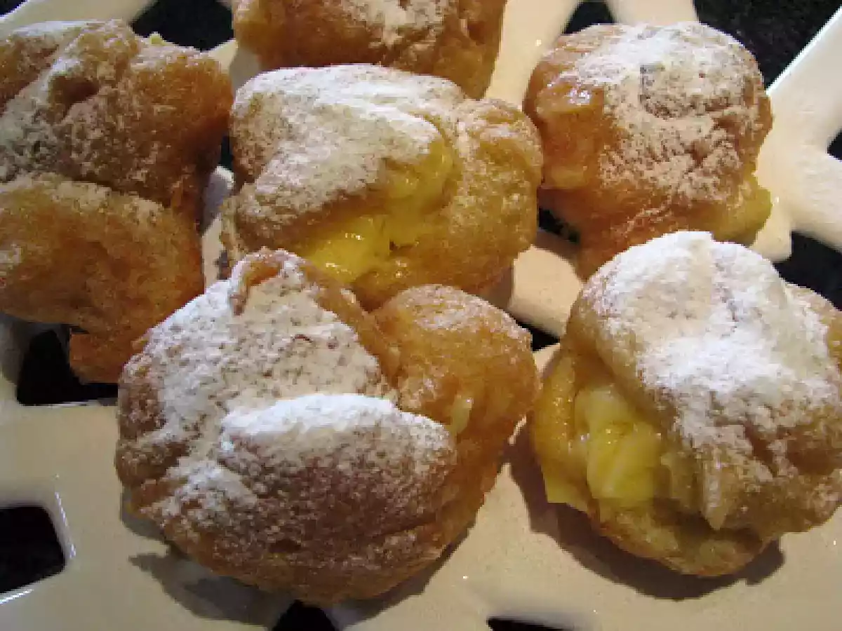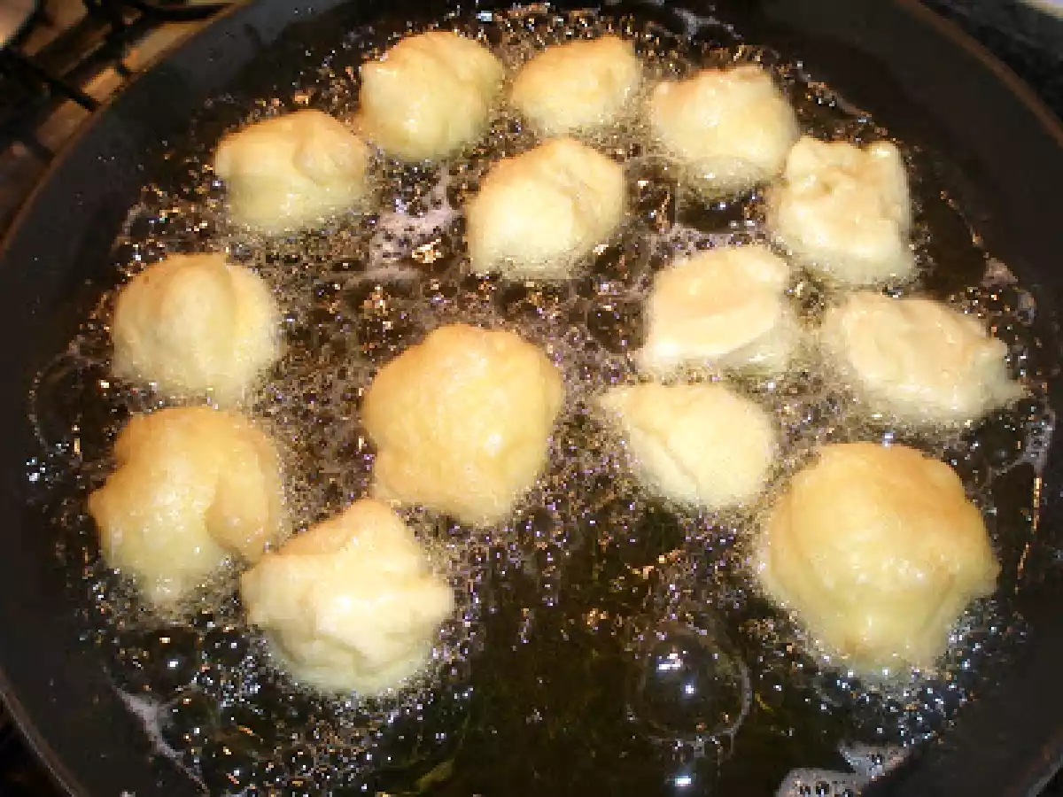 - Quando la pasta sarà vellutata e farà quà e là delle bolle aggiungere un cucchiaino di zucchero e la buccia raschiata d'un limone. Lasciar riposare la pasta. Preparare una padella con abbondante olio e quando il liquido sarà tiepido fate cadere nella padella dei pezzi di pasta. Aumentare il calore del fuoco man mano che si friggono. Le palline si gonfieranno e faranno delle capriole nell'olio