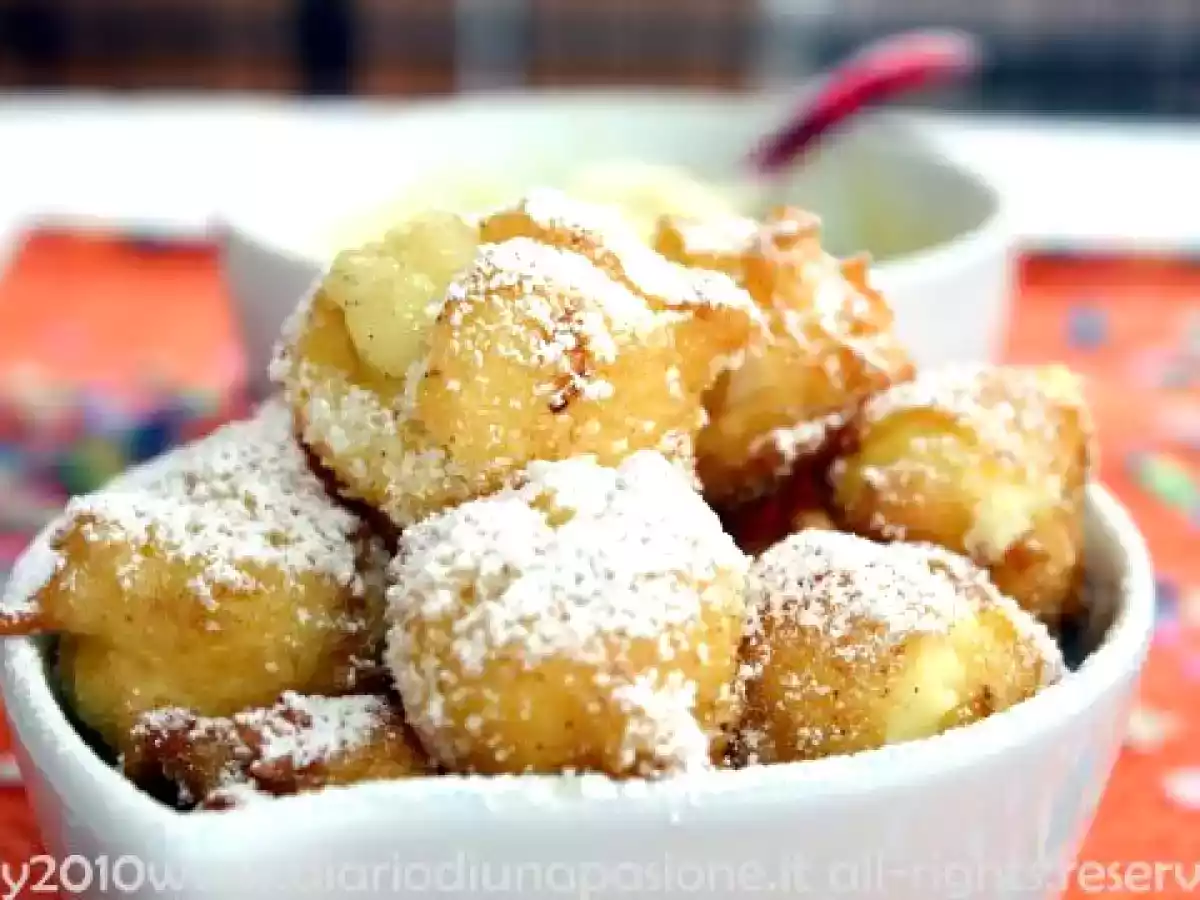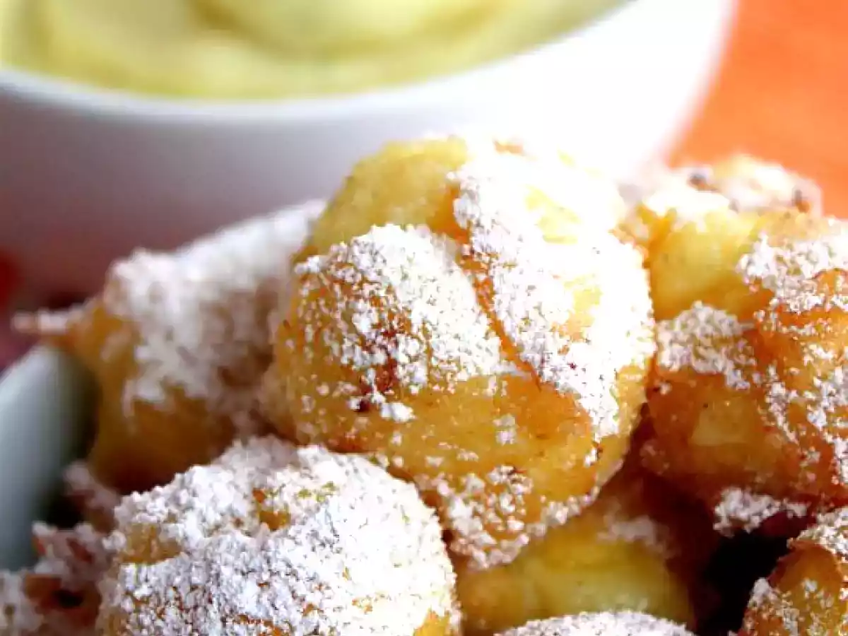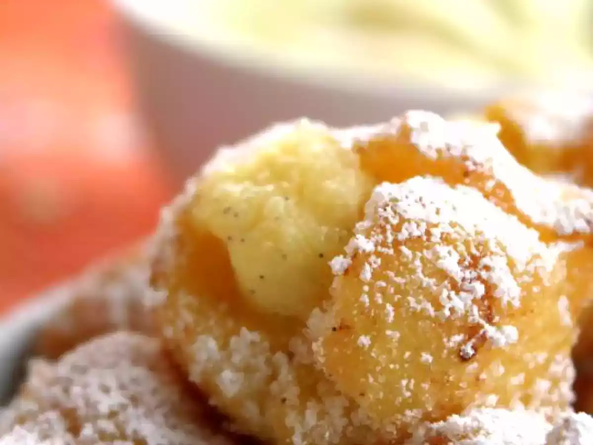 Bignè fritti con crema alla vaniglia PrecedenteProssimo Dessertfacile35 min772 Kcal Invia questa ricetta ad un amico Stampa la ricetta Contatta l'autore della Ricetta Pubblica la foto di questa ricetta Ingredienti 4 Per i bignè: 250 g di acqua 60 g di burro 125 g di farina 3 uova 30 g di zucchero un pizzico di sale Per la crema pasticcera alla panna: 300 ml di latte 200 ml di panna fresca 2 uova intere 150 g di zucchero 40 g di farina un baccello di vaniglia Per la finitura: zucchero a velo olio di semi di arachidi per friggere Costo stimato: 3.03Euros€ (0.76€/Porzioni)