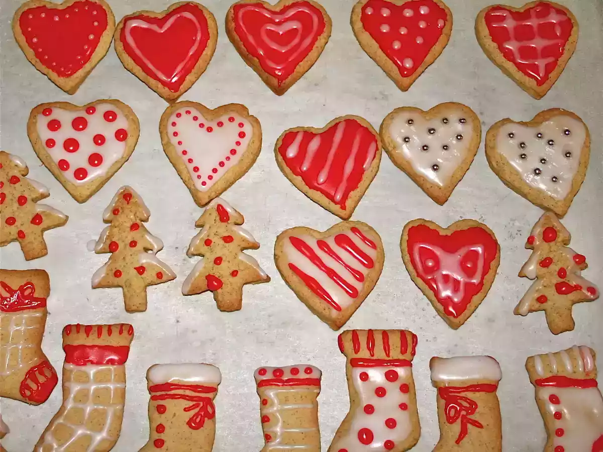 Biscottini natalizi all'arancia e cannella PrecedenteProssimo Dessertmedia40 min881 Kcal Invia questa ricetta ad un amico Stampa la ricetta Contatta l'autore della Ricetta Pubblica la foto di questa ricetta Ingredienti 4 300 gr di farina 0 100 gr di zucchero 120 gr di burro 2 uova 1/2 bustina di lievito vanigliato per dolci un cucchiaio di cannella in polvere essenza di arancio a piacere un pizzico di sale per la glassa: 250gr di zucchero a velo 3/4 cucchiai di acqua calda coloranti alimentari del colore che preferite (ne bastano poche gocce)