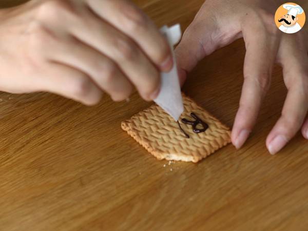 Riempite il sac à poche o la siringa da pasticceria con i 20 gr di cioccolato sciolto. Decorate i biscotti secchi con scritte tipo "RIP" e croci (potete anche rompere un angolo del biscotto per dare un effetto ancora più decadente).