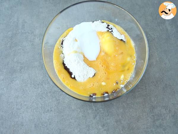 Sciogli il cioccolato insieme al burro. Poi aggiungi lo zucchero, la farina e le uova. Quindi mescola per bene.