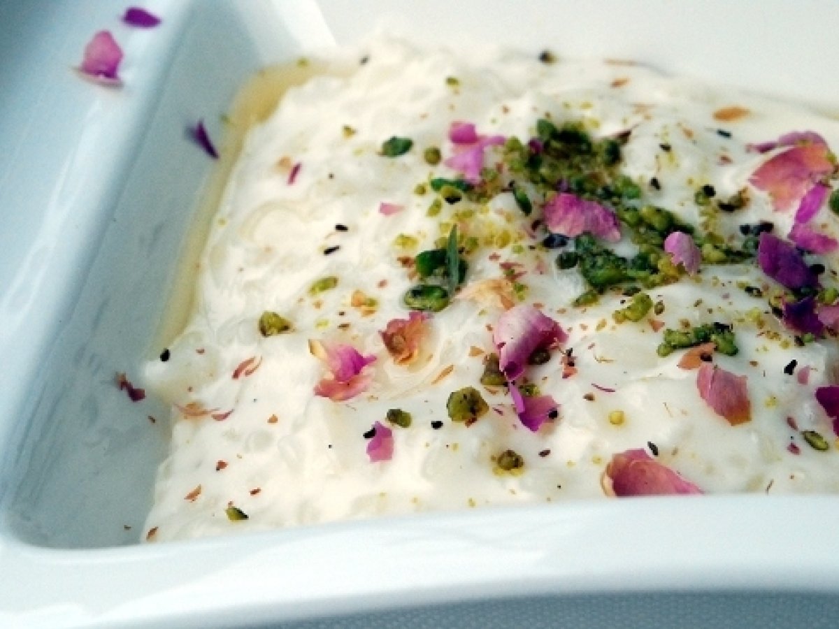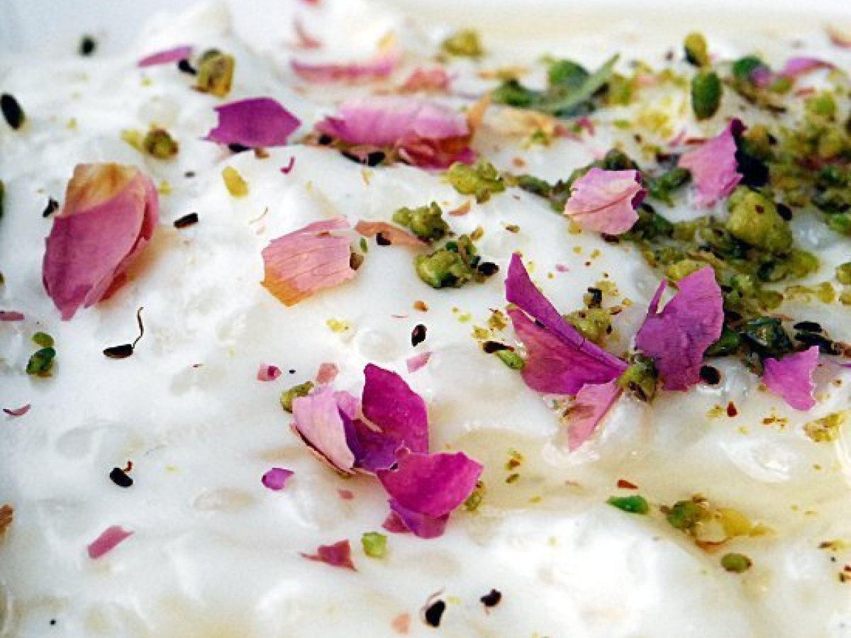 Budino di riso al cardamomo con pistacchi e acqua di rose