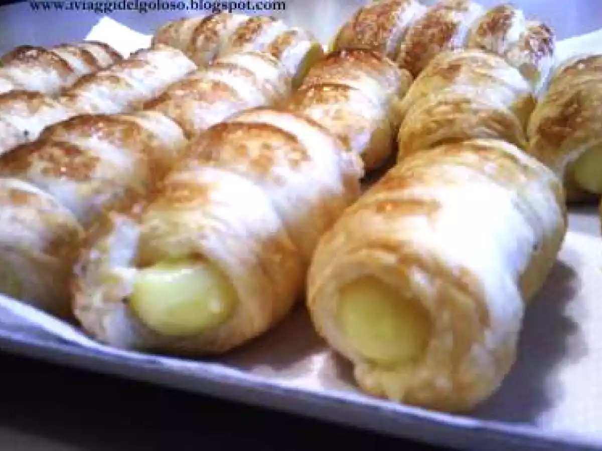 Cannoli alla crema pasticcera PrecedenteProssimo Dessertmedia1 h 30 m Invia questa ricetta ad un amico Stampa la ricetta Contatta l'autore della Ricetta Pubblica la foto di questa ricetta Ingredienti 5 1 rotolo di pasta sfoglia già pronta 250 ml. di latte mezza stecca di vaniglia 13 gr. di burro 100 gr. di zucchero + 1 cucchiaio per spolverare i cannoli 1 uovo + 1 tuorlo 35 gr. di farina