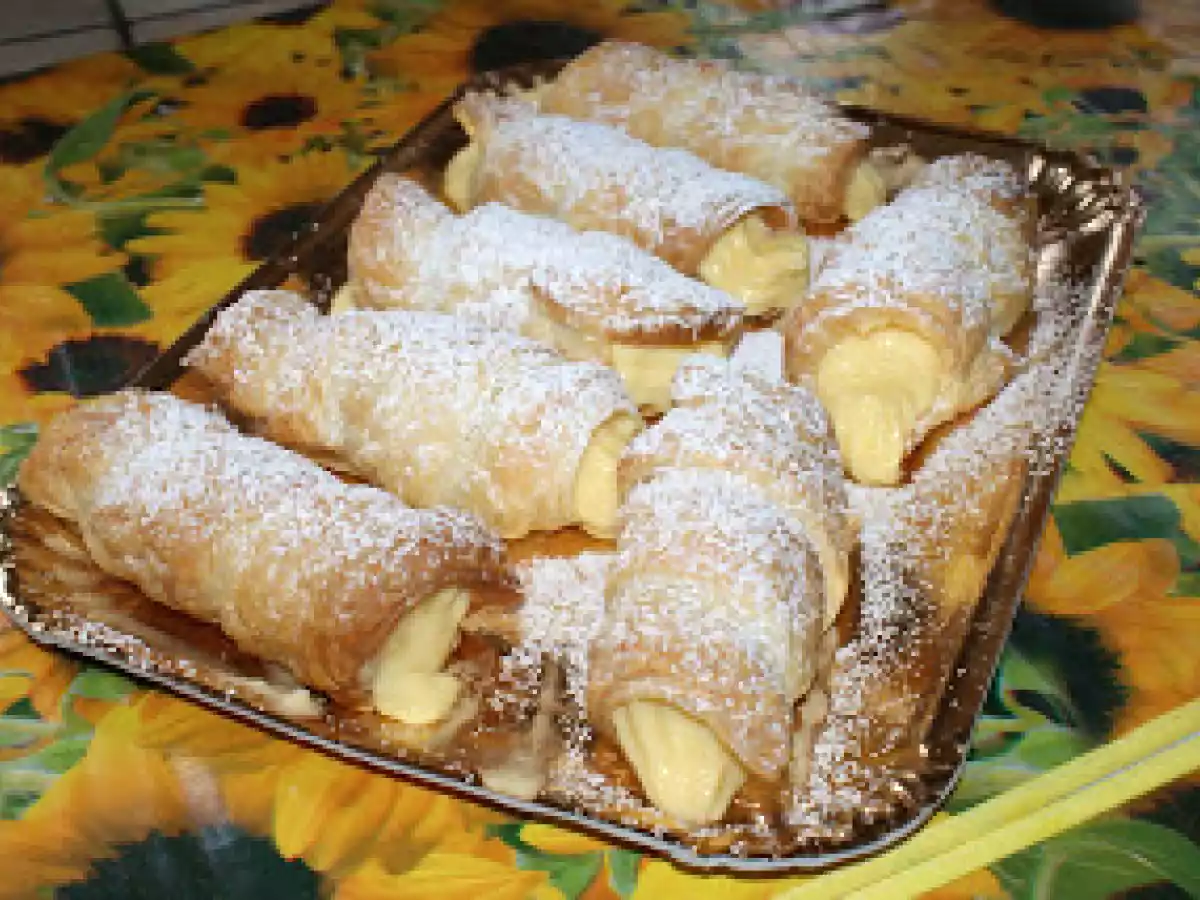 Cannoli di pasta sfoglia con crema pasticcera Dessertfacile45 min516 Kcal Invia questa ricetta ad un amico Stampa la ricetta Contatta l'autore della Ricetta Pubblica la foto di questa ricetta Ingredienti 3 250 g di pasta sfoglia 1 dose di crema pasticcera