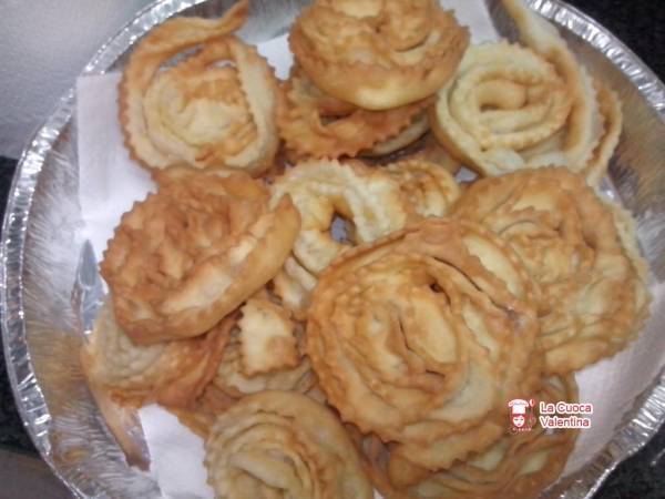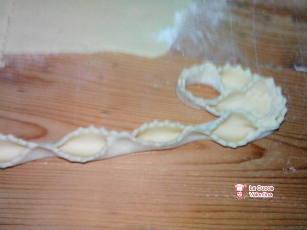 Iniziare a ricavare dalle sfoglie, strisce larghe 2 cm. Piegarle a metà e ogni 2-3 “pizziacare” la sfoglia.Arrotolare la sfoglia su se stessa ” pizzicandola” ogni tanto. Ottenere una girandola.