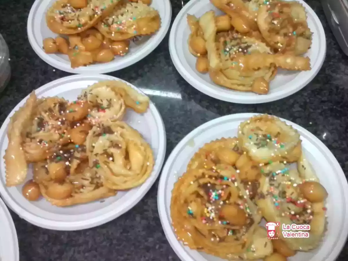 Le cartellate o carteddate sono dei dolci pugliesi che vengono preparati per la festa del Natale. Vengono preparate durante questo periodo, perchè secondo la tradizione cristiana, rappresentano l’aureola o le fasce che avvolsero Gesù Bambino, quando nacque. Io le ho tuffate nel miele, ma possono essere farcite anche con il vin cotto.