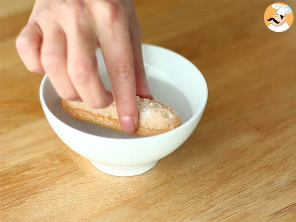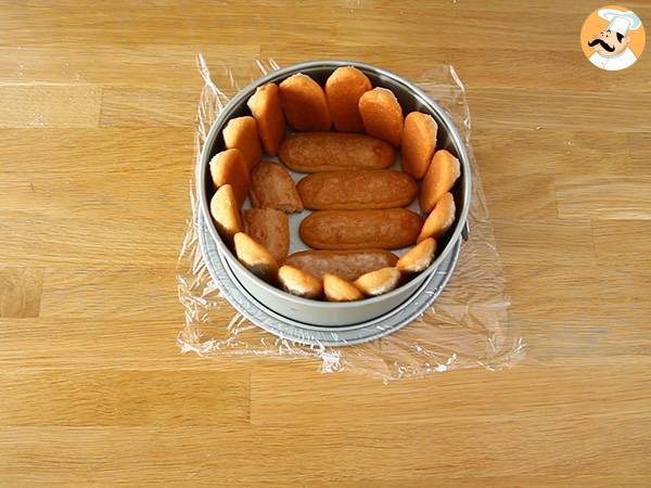 Foderate la base dello stampo a cerniera con la pellicola. Imbevete rapidamente i savoiardi nell'acqua (solo la parte liscia del biscotto)