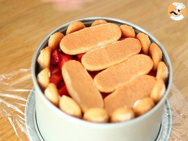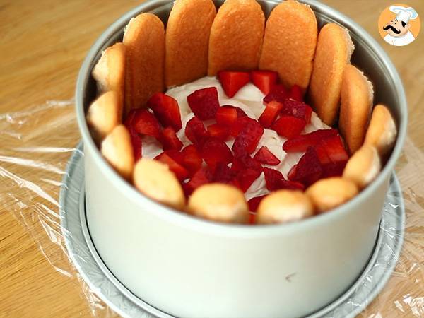 Prendete la mousse che rimane e mettetela nello stampo. Aggiungete delle fragole a pezzetti e terminate il dessert con un altro strato di savoiardi. Coprite con la pellicola e lasciate riposare il dolce in frigorifero per almeno 4 ore.