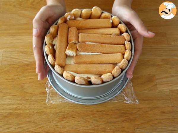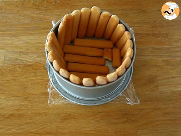 Bagnate velocemente una parte savoiardi e disponeteli sulle pareti dello stampo, poi anche sulla base.