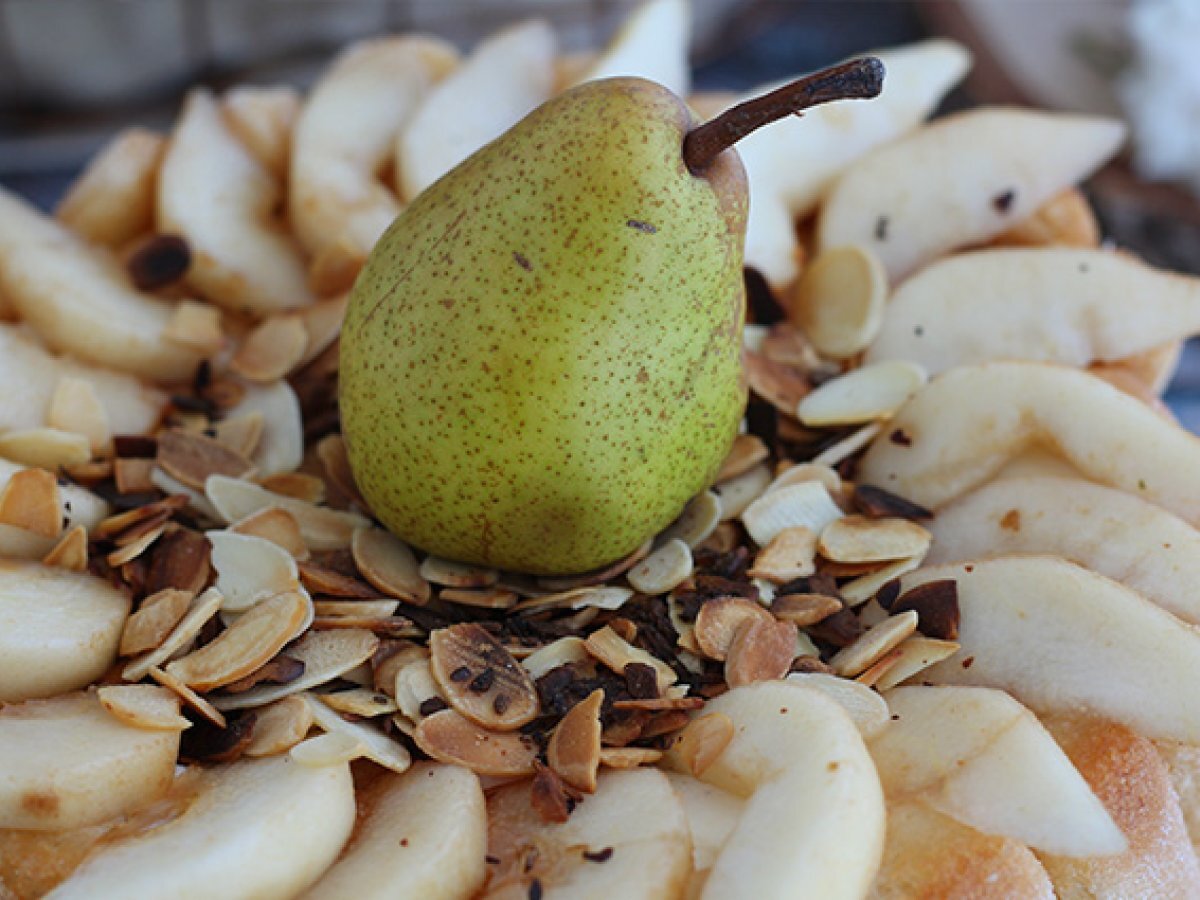 Sbucciate le medie e tagliatele a fettine sottili. Disponetele una di fianco all'altra sul bordo della charlotte. Mettete nel mezzo le mandorle tostate ed infine la piccola pera intera (guardate il tutorial video a fondo pagina)