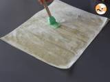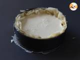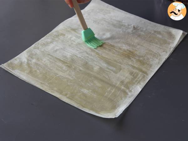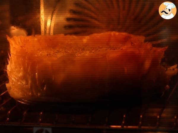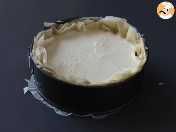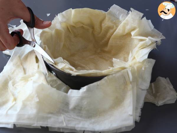 Tagliate i bordi della pasta fillo che fuoriescono dallo stampo e adagiateli sulla base della tortiera per non buttarli