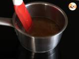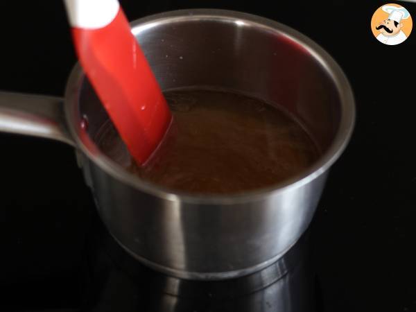 Versare l'acqua, lo zucchero e il miele in un pentolin a fuoco medio. Mescolate il tutto con una spatola e lasciate addensare lo sciroppo per circa 10-15 minuti.