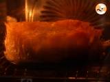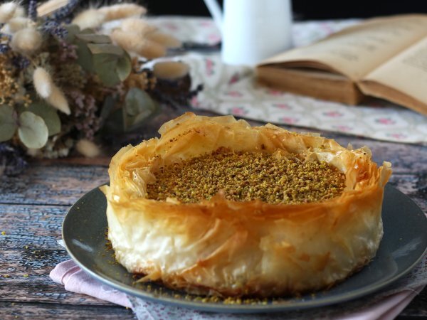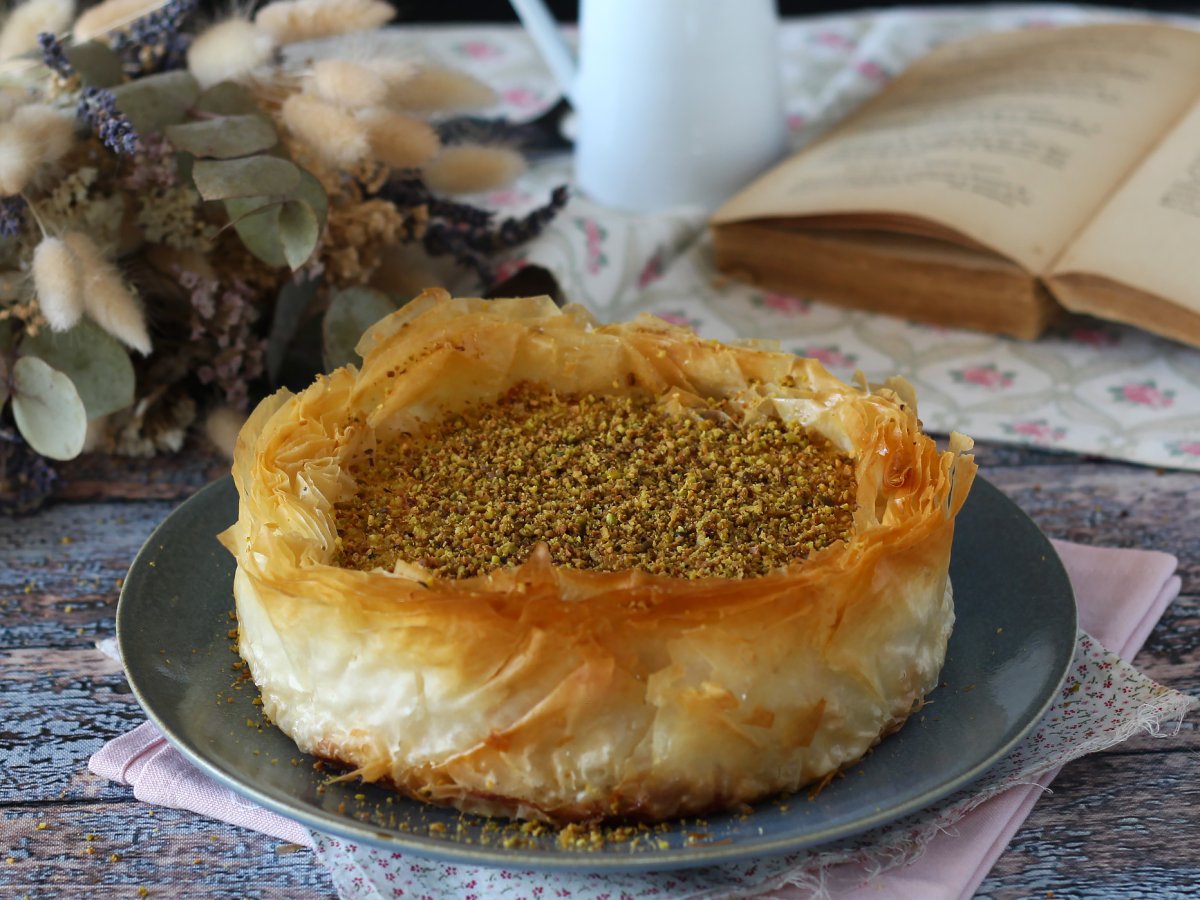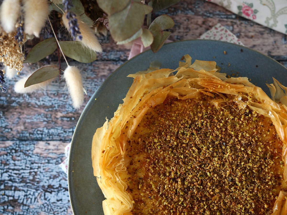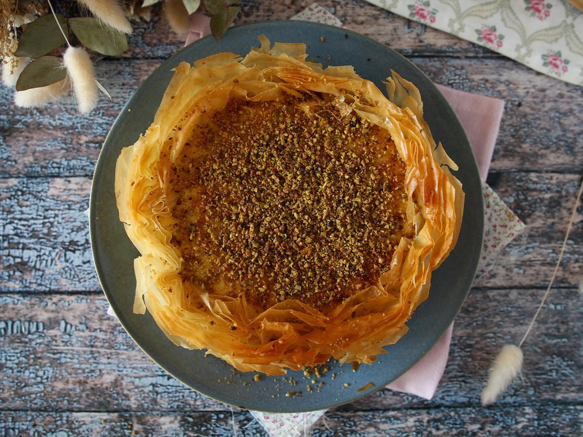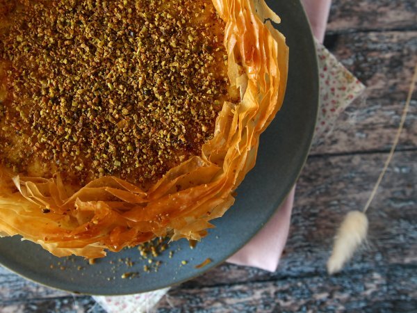 Noi abbiamo continuato la cottura per altri 20 minuti dopo aver aggiunto lo sciroppo ed i pistacchi tritati in superficie ma potete anche optare per una precottura della base: mette in forno solo la base di pasta fillo + burro per 20 minuti a 180°C e poi continuate con tutte le altre fasi della ricetta.