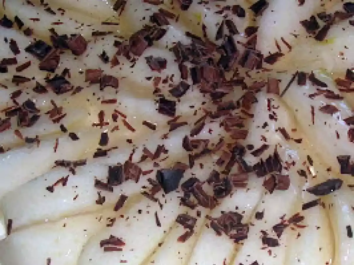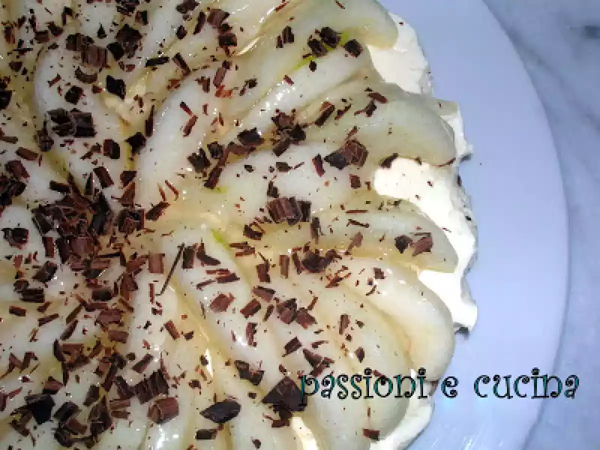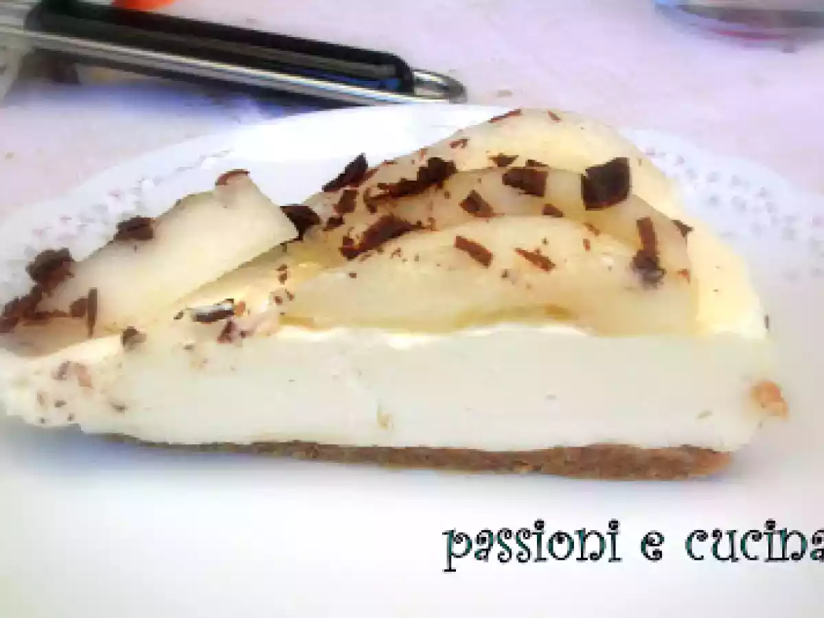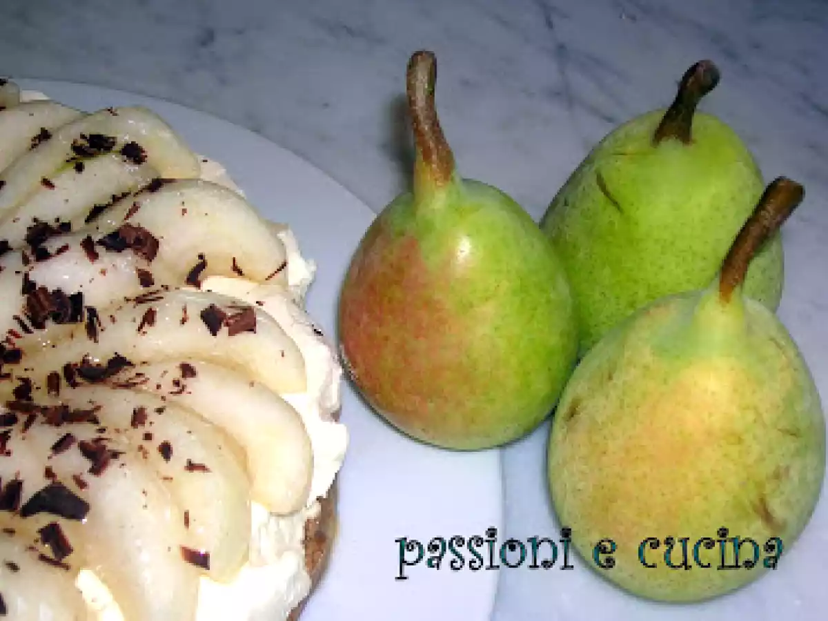 Cheesecake alle pere vota adesso PrecedenteProssimo Dessertfacile3 h 10 m Invia questa ricetta ad un amico Stampa la ricetta Contatta l'autore della Ricetta Pubblica la foto di questa ricetta Ingredienti 4 500 g di mascarpone 200 ml di panna da montare 4 cucchiai di fruttosio o 7 cucchiai di zucchero 12 gr di colla di pesce 2 cucchiai di latte 5 o 6 pere cosce 30 g circa di cioccolato fondente 1 bustina di tortagel Per la base: 150 g di amaretti 100 g di biscotti secchi 150 g di burro 2 cucchiai di liquore all'amaretto