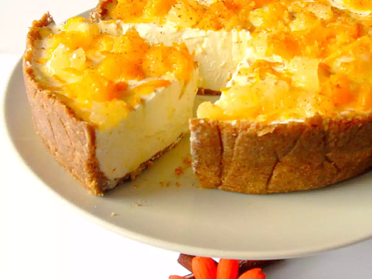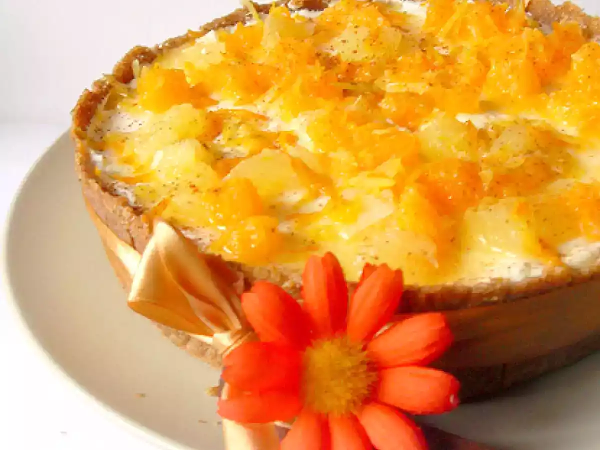 Cheesecake di agrumi e cannella PrecedenteProssimo Dessertmedia55 min Invia questa ricetta ad un amico Stampa la ricetta Contatta l'autore della Ricetta Pubblica la foto di questa ricetta Una cheesecake da acquolina in bocca Ingredienti 8 Per la base: 200 g di biscotti digestive 100 g di burro morbido 1 pizzico di cannella Per la farcia 300 g di ricotta 2 yogurt agli agrumi 200 g di Philadelphia 200 g di panna montata Scorza di limone e arancia 100 g di zucchero a velo 10 g di colla di pesce in fogli 1/2 cucchiaino di cannella in polvere Per la copertura: 1 arancia e 1 limone pelati a vivo e tagliati a cubetti 1 cucchiaio di miele 1 cucchiaino di cannella