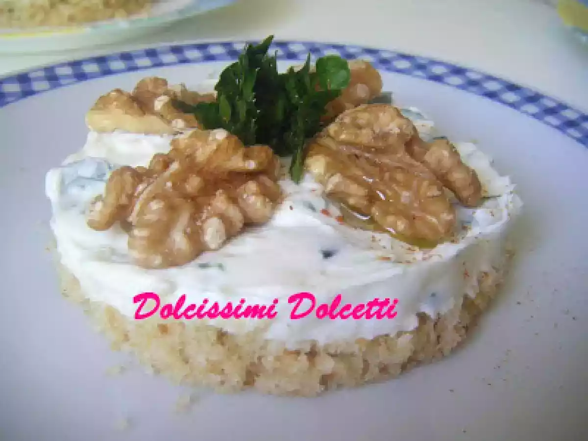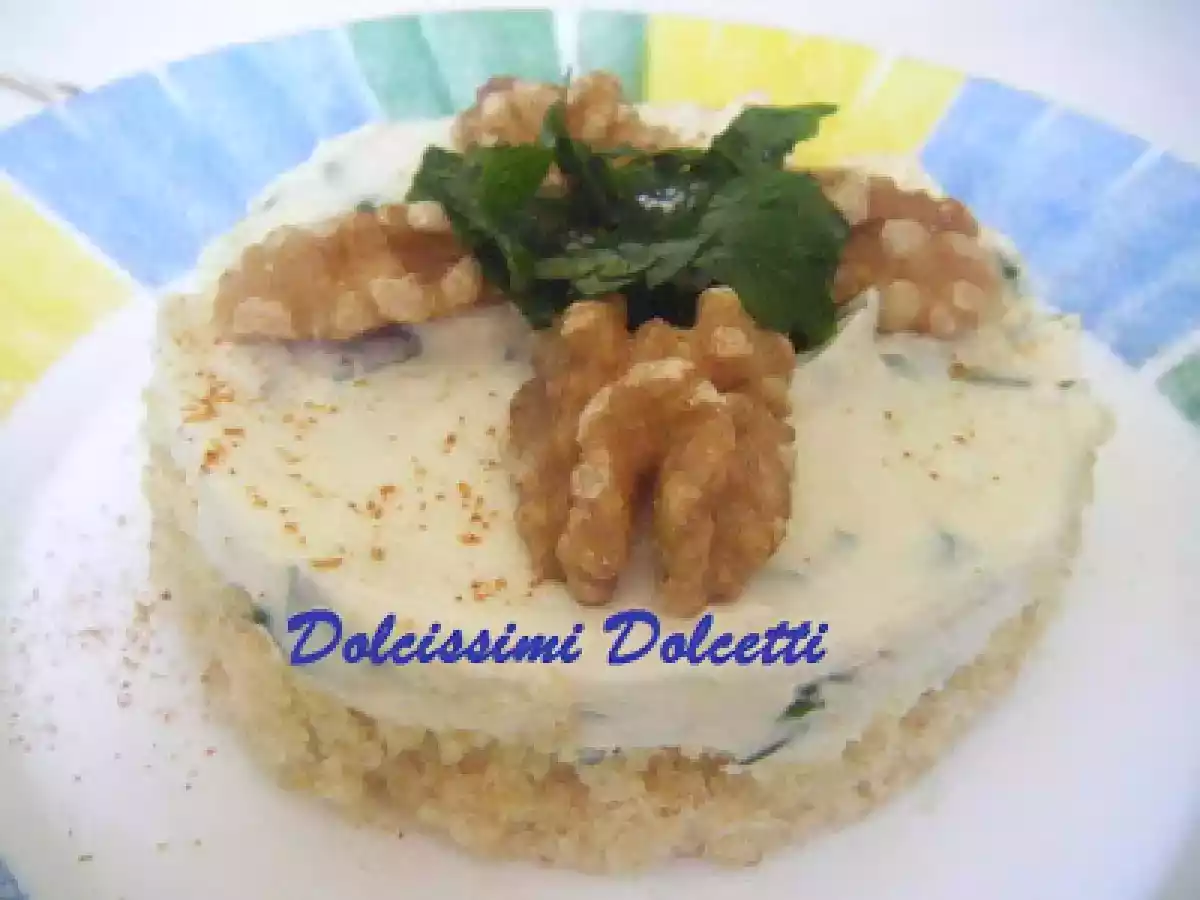 Cheesecake salato alle erbe e noci vota adesso PrecedenteProssimo Dessertfacile1 ora Invia questa ricetta ad un amico Stampa la ricetta Contatta l'autore della Ricetta Pubblica la foto di questa ricetta Ingredienti 4 Per la base: 5 fette di pancarrè 4-5 cucchiai d'olio 60 g di parmigiano Per la parte sopra: 250 g di philadelphia 100 g di squacquerone 10 foglie di basilico un mazzetto di prezzemolo olio sale peperoncino 40 g di noci