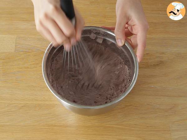 In una ciotola mescolate tutti gli ingredienti secchi: la farina, lo zucchero, il cacao e il lievito
