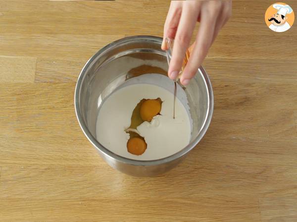 In un'altra ciotola mescolate la panna liquida con le uova e l'aroma di vaniglia