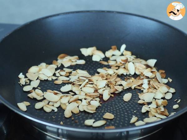Tostate le lamelle di mandorle in una padella ben calda, mescolando di tanto in tanto, per 5 minuti. Una volta pronte mettete da parte e lasciatele raffreddare.