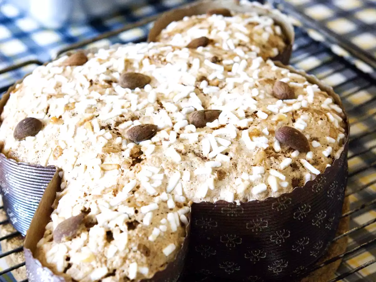 L'impasto sara' raddoppiato in volume. - Preparate la glassa frullando la mandorle pelate con lo zucchero e l'albume. Spennellate la glassa sulla superficie facendo attenzione a non smontare l'impasto.Guarnite con granella di zucchero e le mandorle con la buccia.