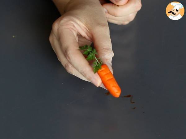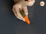 Incorporate il colorante nella pasta di mandorla e formate delle palline che dovrete arrotolare per poi formare dei cilindri. Pianta un rametto di prezzemolo sopra e fai delle strisce per dare l'effetto delle pieghe tipiche della carota